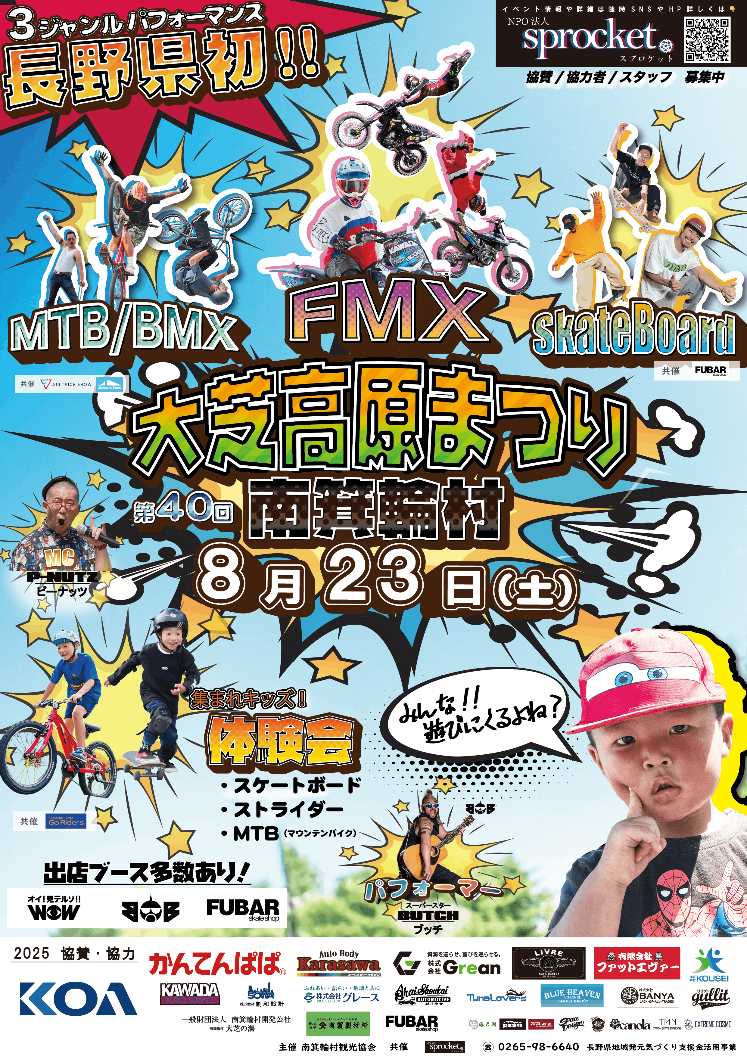 今年度もFMXプレイヤー達を呼ぶことはもちろん、MTB/BMXやスケボーのパフォーマンスを『南箕輪村 大芝高原まつり』で見てもらうことが、未来の活動につながると確信しています。