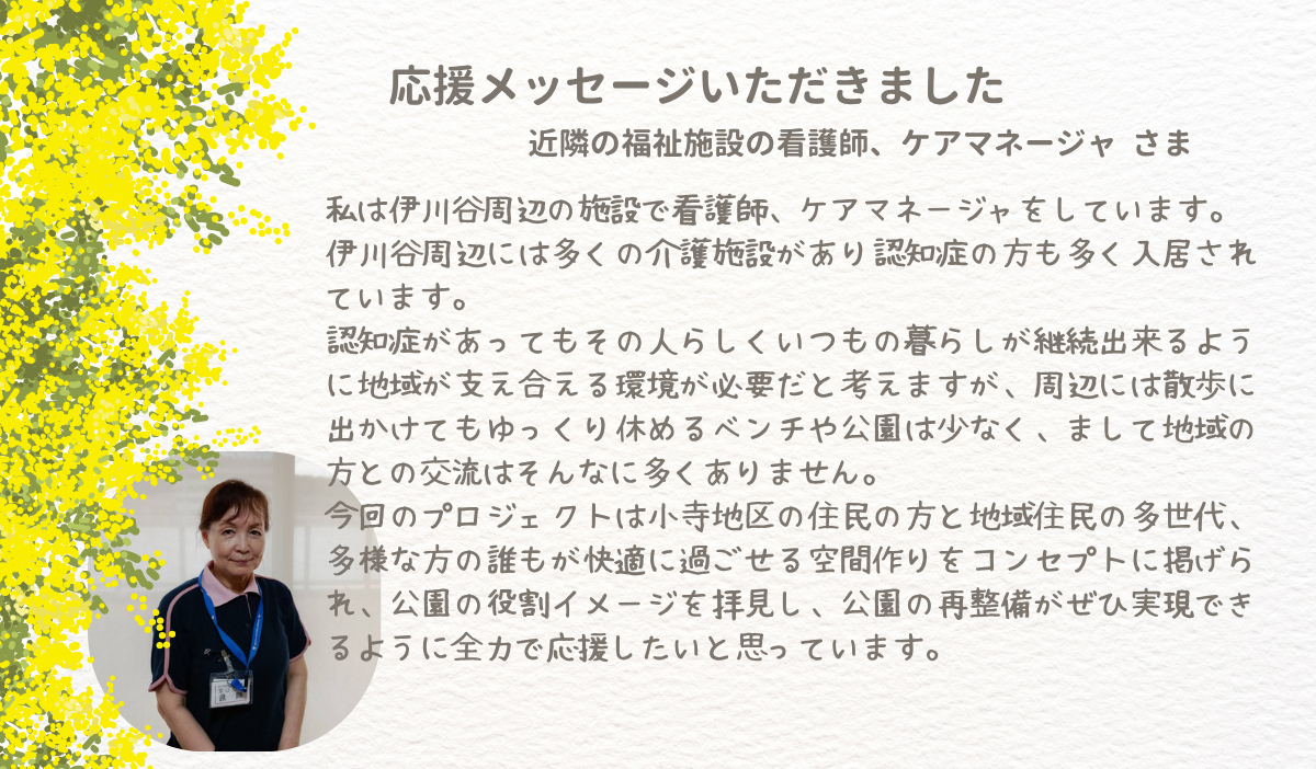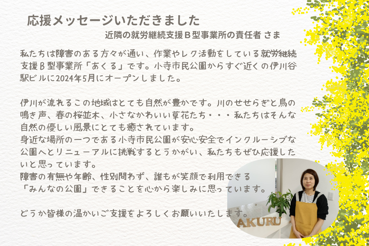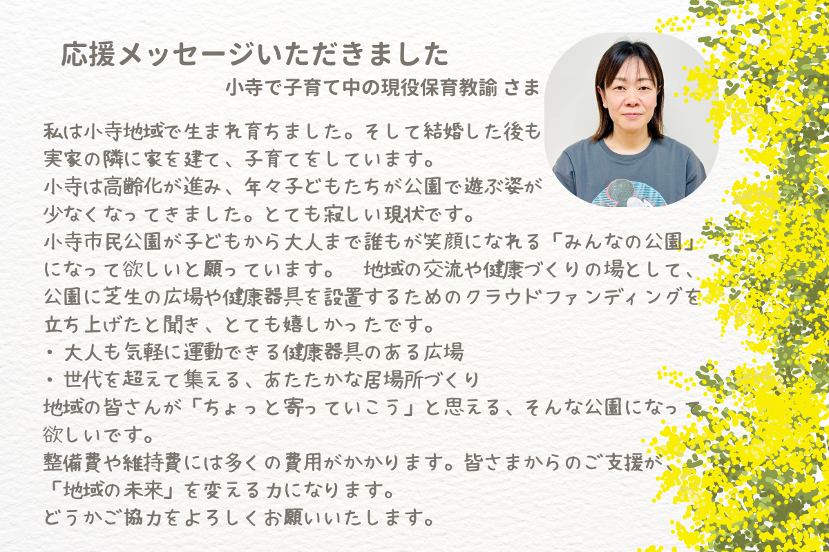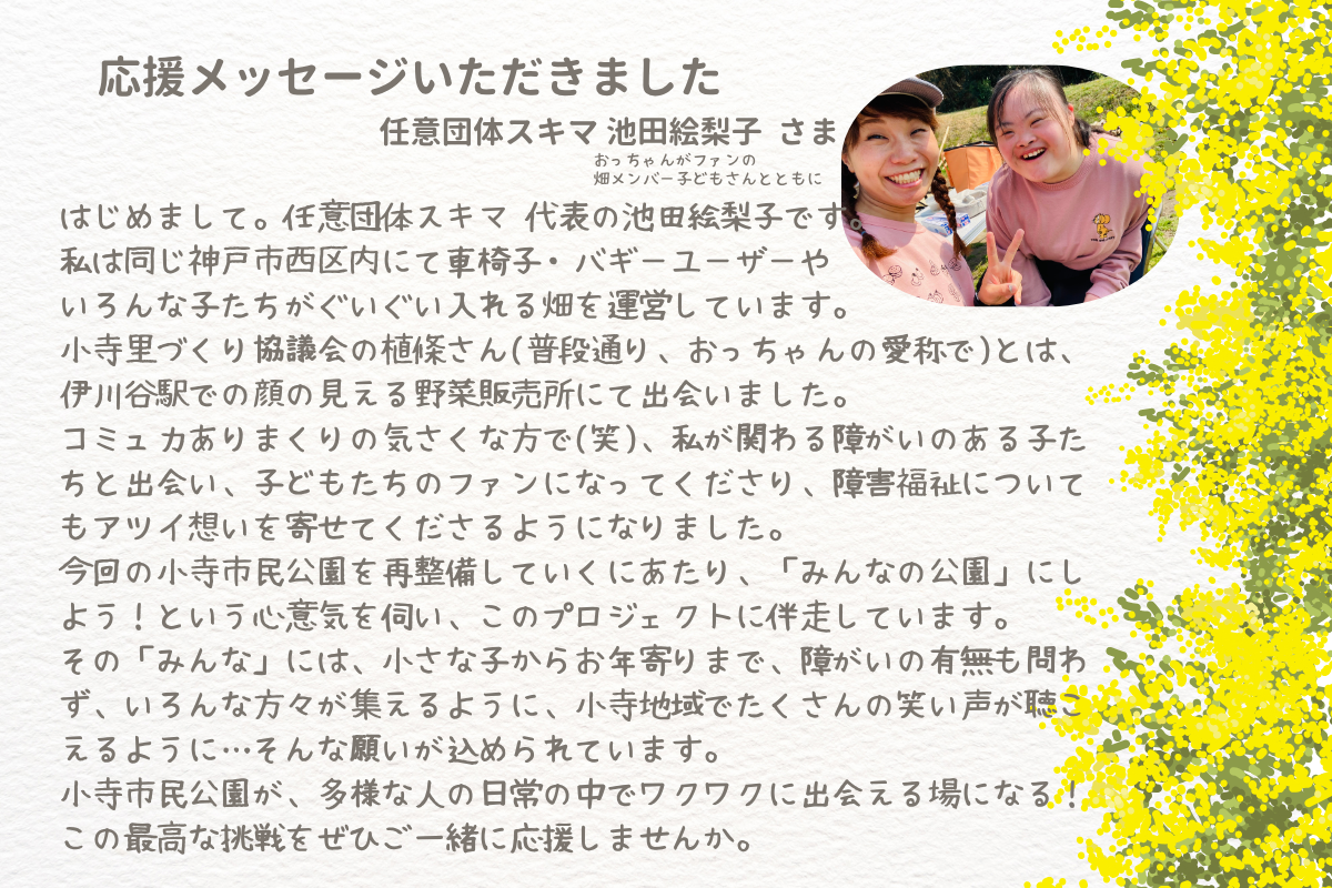 私たちは、小寺市民公園を地域の多様な人々が集い、安全安心で楽しむことができるインクルーシブなコミュニケーション空間にするために、このプロジェクトを立ち上げました。