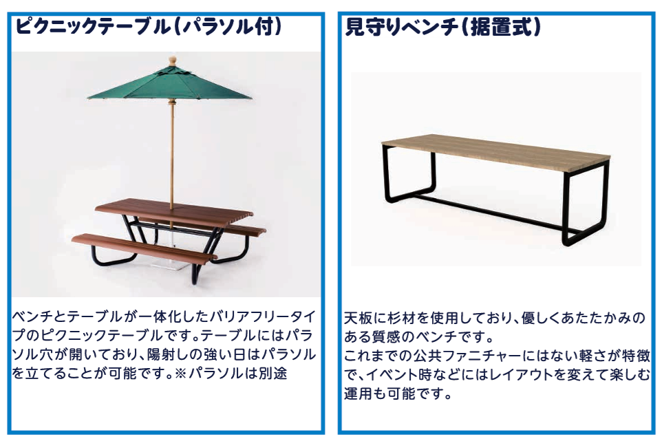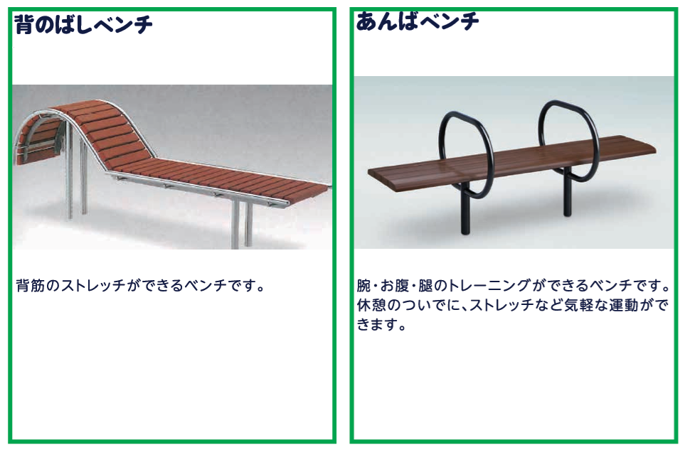 ・公園遊具、健康器具、見守りベンチ、ピクニックテーブル、防災ベンチ 等