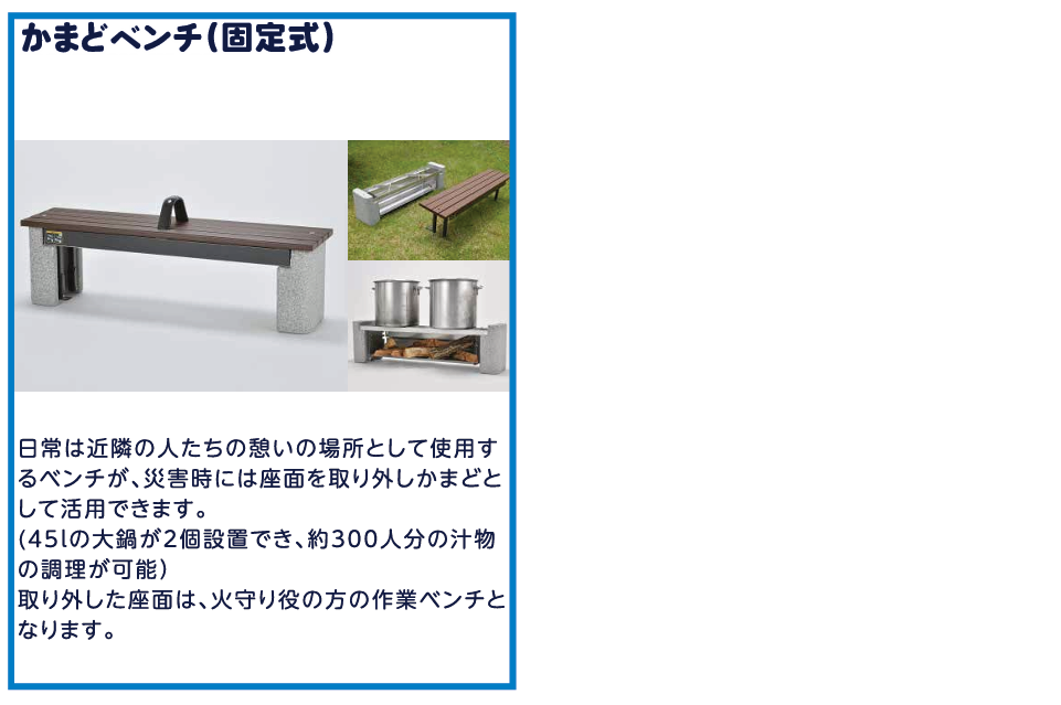 ● 防災用設備として、炊き出し用かまどベンチを設置し、テント式防災簡易トイレを具備した「防災パーク」を目指します。