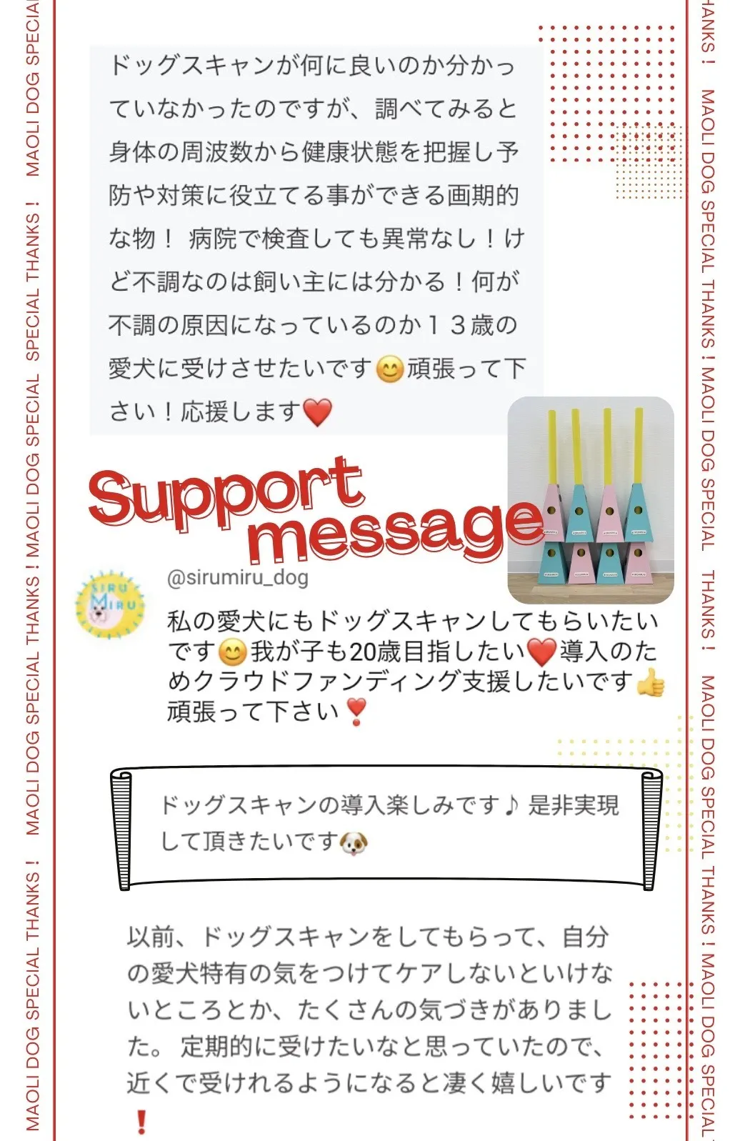 ドッグスキャンが何に良いのか分かっていなかったのですが、調べてみると身体の周波数から健康状態を把握し予防や対策に役立てる事ができる画期的な物! 病院で検査しても異常なし!けど不調なのは飼い主には分かる!何が不調の原因になっているのか13歳の愛犬に受けさせたいです😊頑張って下さい!応援します❤️
