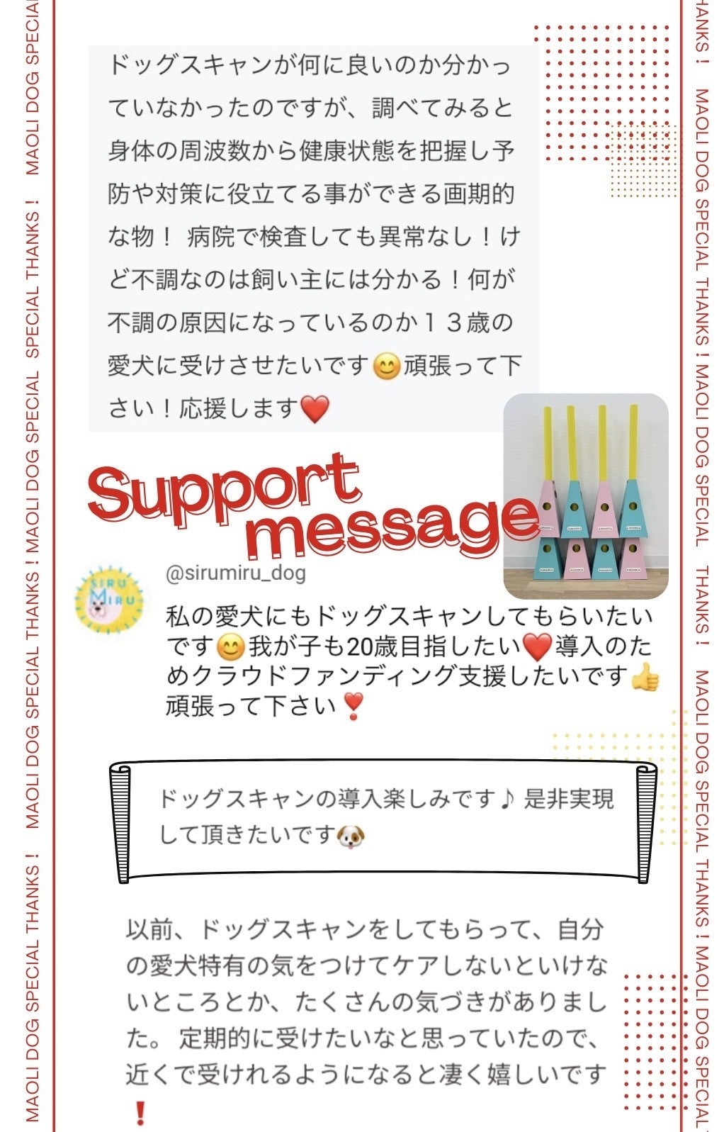 ドッグスキャンが何に良いのか分かっていなかったのですが、調べてみると身体の周波数から健康状態を把握し予防や対策に役立てる事ができる画期的な物! 病院で検査しても異常なし!けど不調なのは飼い主には分かる!何が不調の原因になっているのか13歳の愛犬に受けさせたいです😊頑張って下さい!応援します❤️