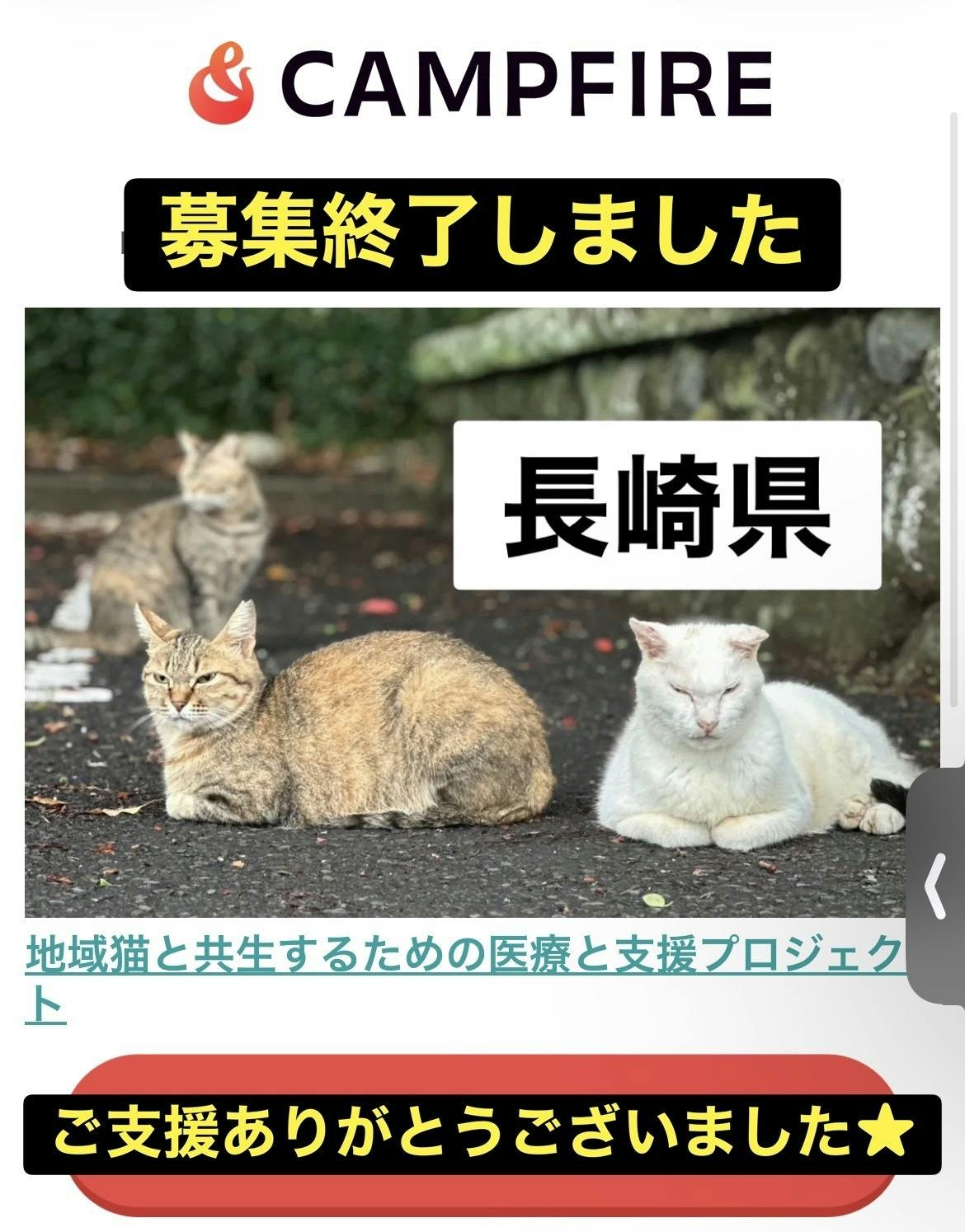 2026/01/04 14:00本日、「地域猫と共生するための医療と支援プロジェクト」無事に募集を終了いたしました。皆さまのおかげで、120,500円 のご支援を集めることができました。たくさんの温かい応援とご支援、本当に、本当にありがとうございます。皆さまからお預かりした大切な支援金は、地域猫たちの医療費や日々のケア、今後の支援活動のために大切に使用させていただきます。引き続き、活動の様子は活動報告にてお伝えしてまいります。これからも、どうぞ温かく見守っていただけますと幸いです。 もっと見る