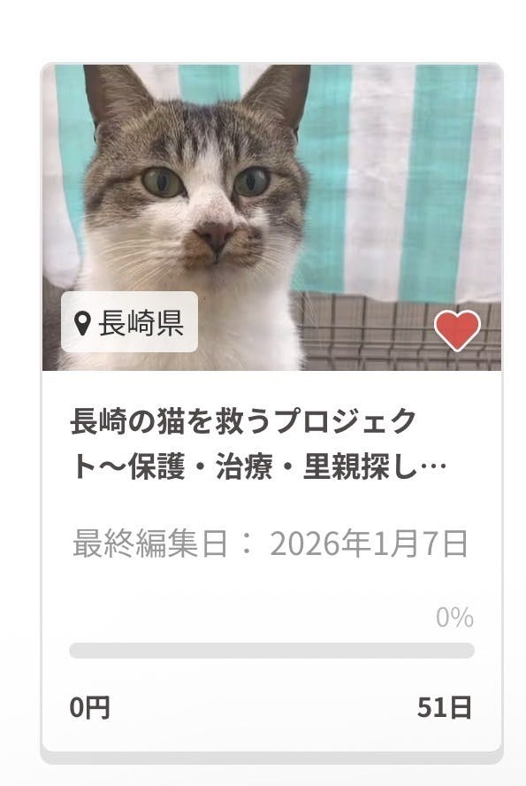 2026/01/09 16:00クラウドファンディングを再開しました。前回はたくさんのご支援、本当にありがとうございました。皆さまのお力添えのおかげで、前回よりもお世話できているお外の猫ちゃんの数が増え、現在は 15匹 の猫ちゃんを継続して見守り・お世話しています。ご支援は、猫たちのごはん代や医療費、衛生用品など、命を守るために大切に使わせていただいています。引き続き、猫たちが安心して過ごせる環境を守っていけるよう活動を続けてまいります。温かい応援をどうぞよろしくお願いいたします。Amazon欲しいものリスト公開こちらをタップ もっと見る