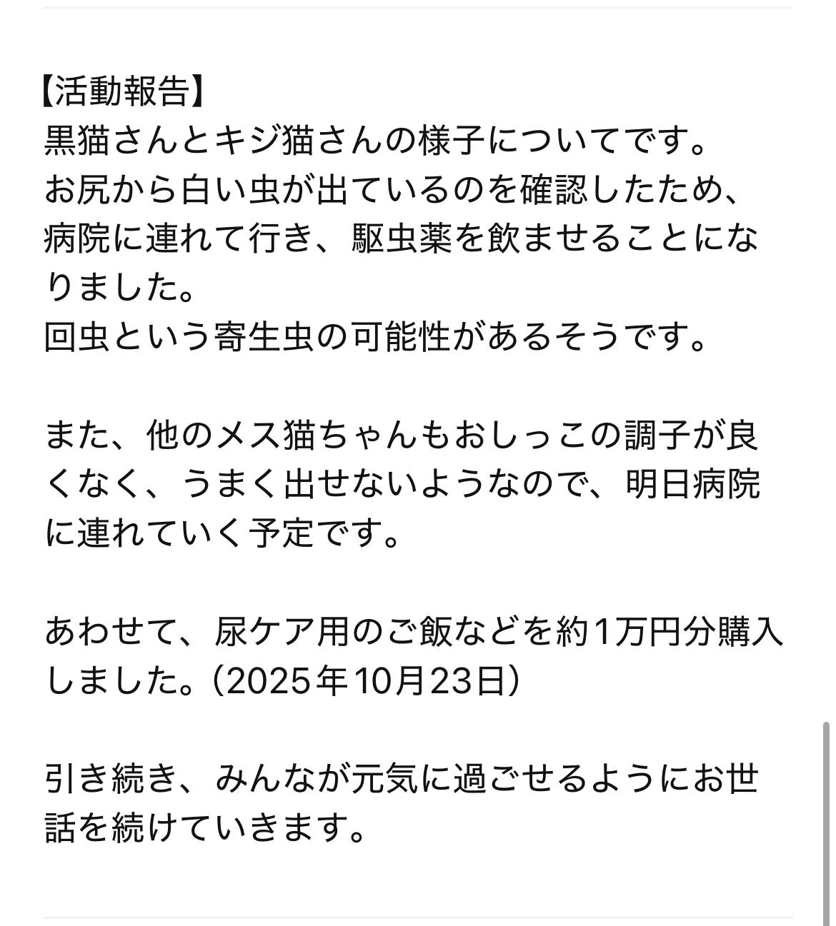 • 保護猫の医療費(ワクチン接種・不妊去勢手術・病気やケガの治療など) • フードやミルク、猫砂など日常の飼育費用 • 保護スペースの整備や清掃用品の購入 • 野良猫の捕獲用ケージや搬送費 • SNS発信や里親募集のための広報活動費 • 緊急時の医療費やシェルター維持費
