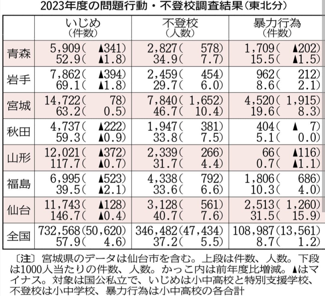 ※文部科学省の調査結果(2023年度)で宮城県の不登校生徒の割合が中学校で全国1位となり、全国ワーストの8.32%に達しました。これは4年ぶりの全国最多で、小中高校全体の不登校児童生徒数も9,767人に増加しました。
