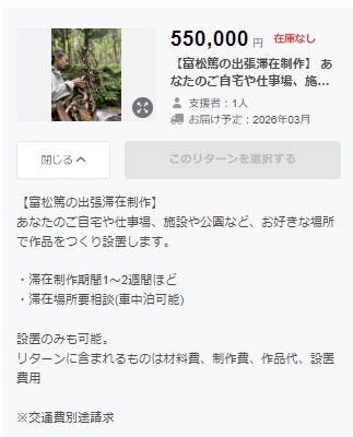 リターンに含まれるものは材料費、制作費、作品代、設置費用