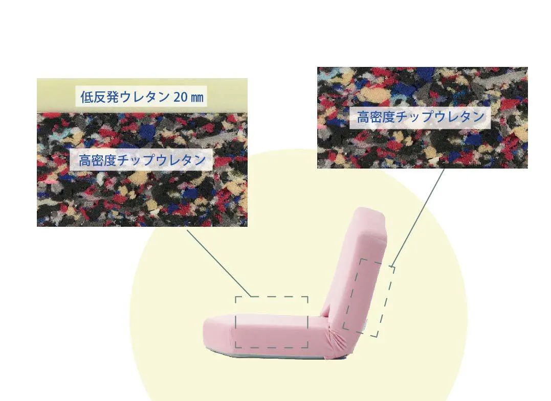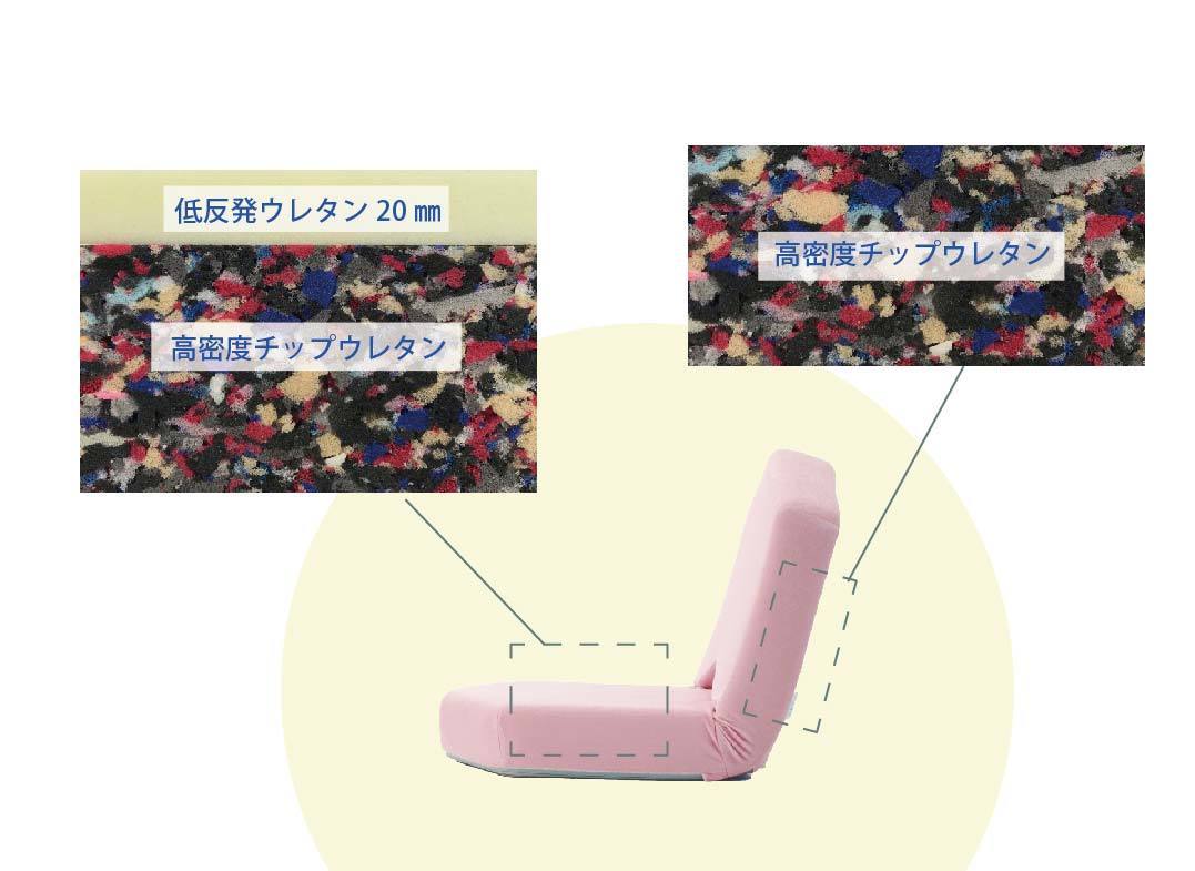 また座面は低反発ウレタンをたっぷり20mm入れ、その下にかための高密度チップウレタンを入れることで、