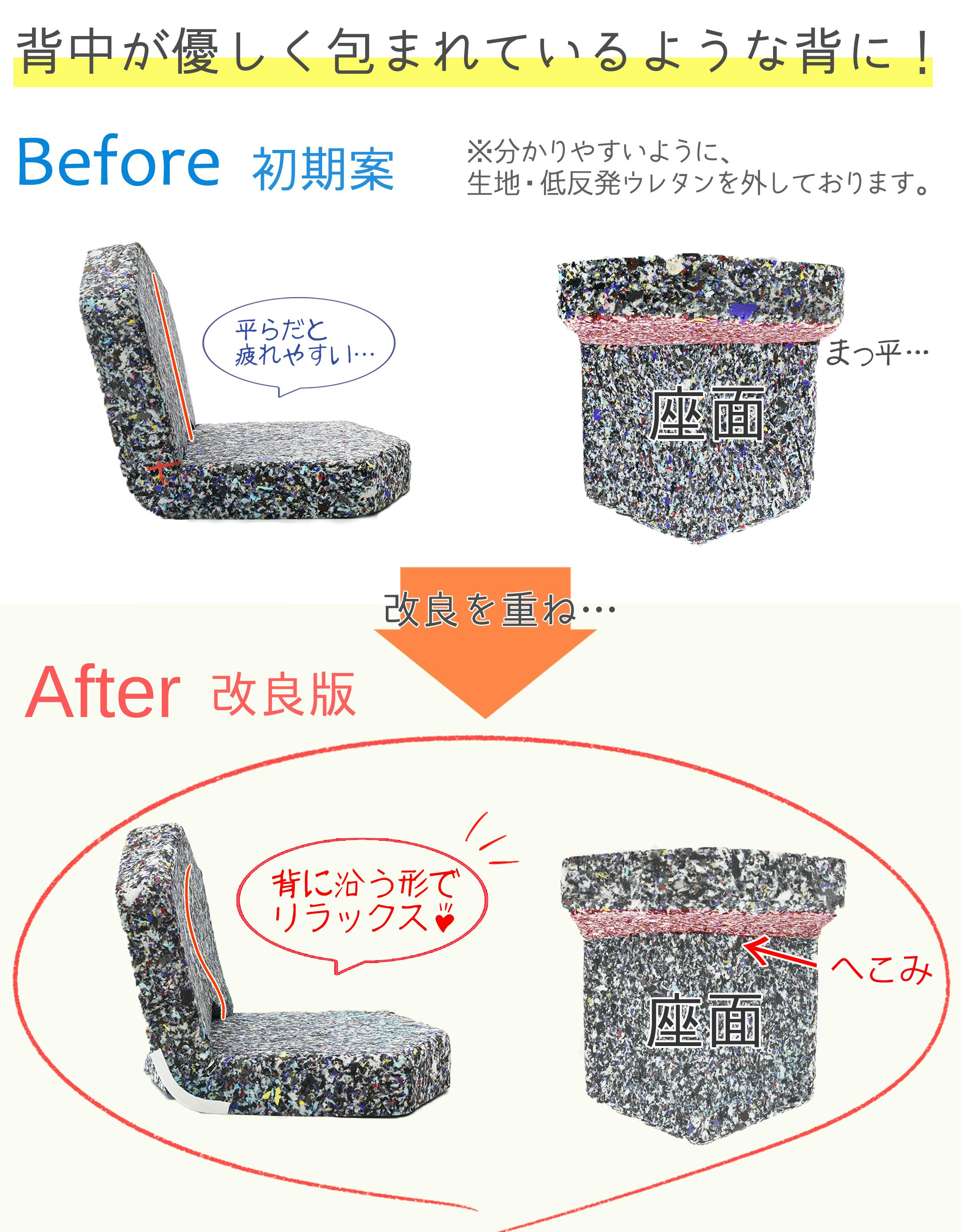 背面は柔らかいと疲れやすいため、かための高密度チップウレタンを使用し、長時間座っても疲れにくい形状に、