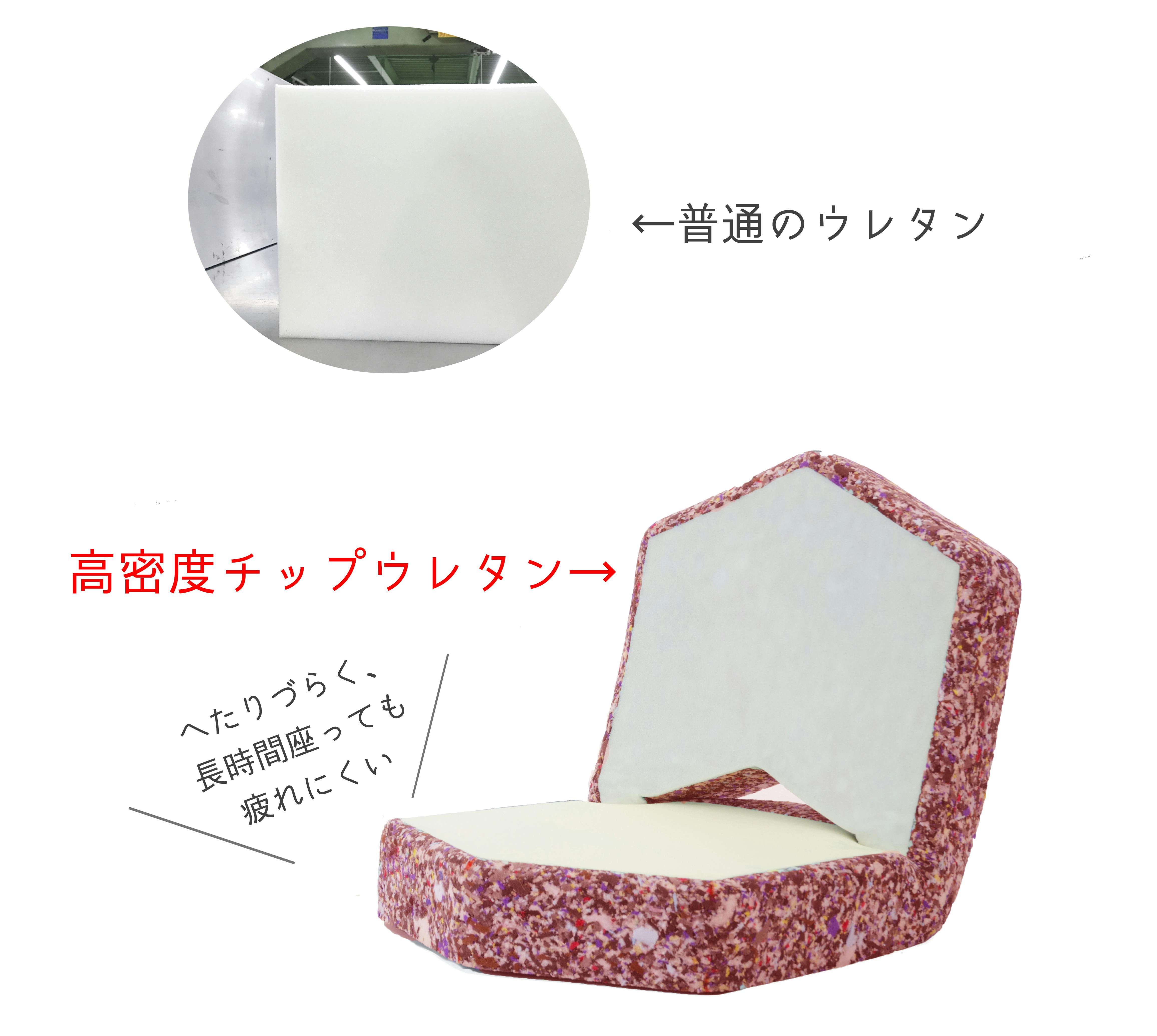 また高密度チップウレタンはかたいので、長時間座っても疲れにくいというメリットもあります。