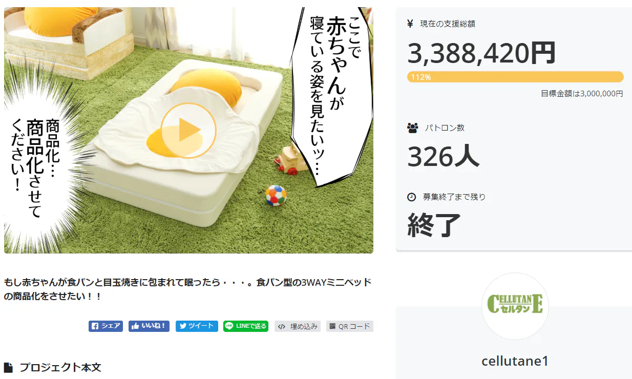 前回のクラウドファンディングは食パンミニベッドでALL or Nothingに挑戦し、300万円の目標金額も無事達成することができました