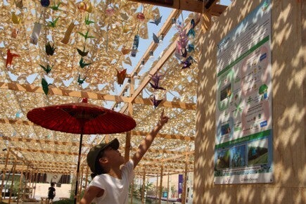 フラクタル日よけとは、自然が作り出す「木漏れ日」のような空間を再現する日よけです。「フラクタル構造」という、自然の中にも見られる複雑な幾何学模様の形を利用して、お日様の光を遮りつつ、適度な隙間から風と光を通します。このフラクタル日よけの技術は、2023年の国際園芸博覧会の日本ブースでも紹介された技術です。