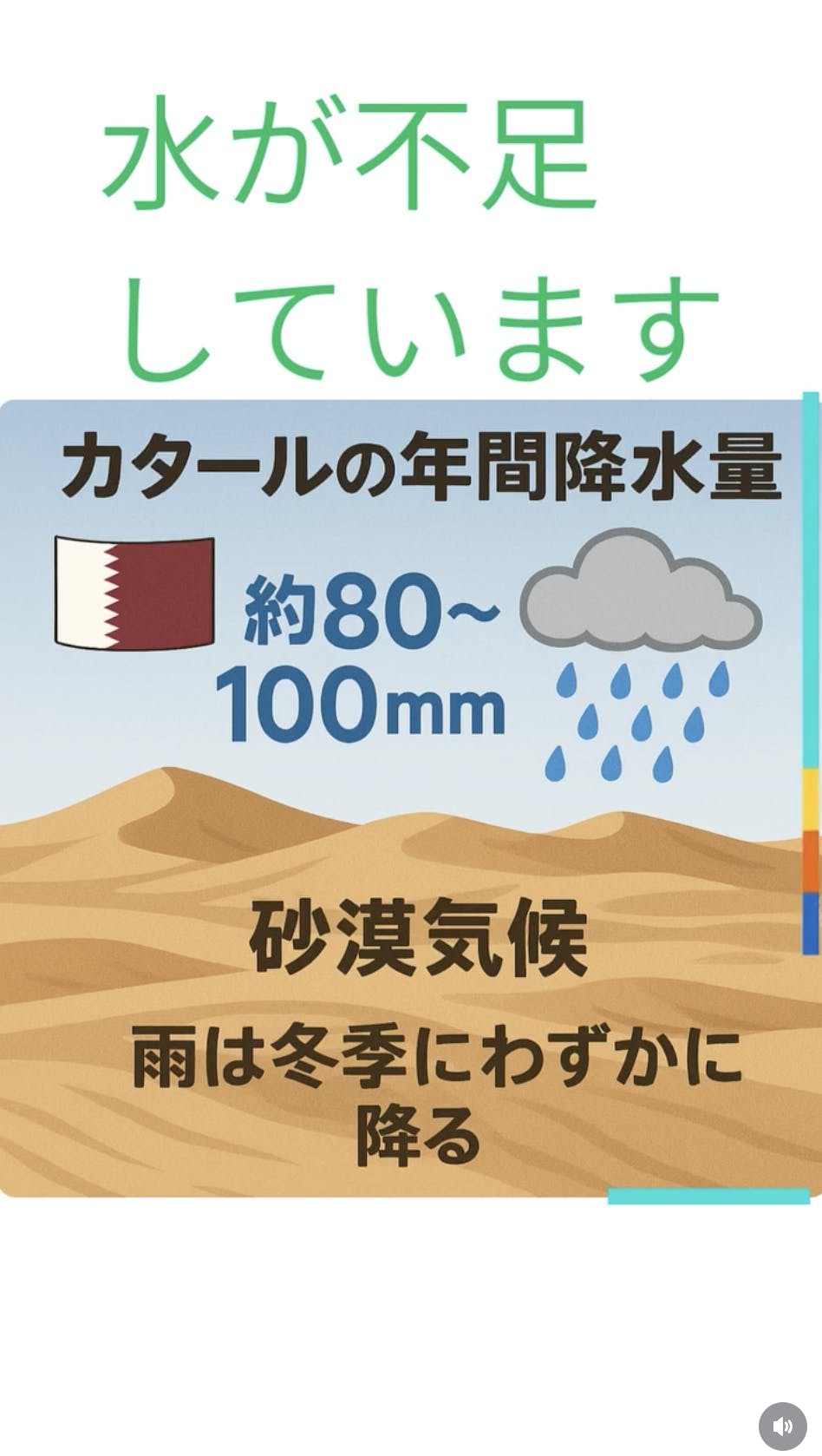 カタールは国土の大部分が砂漠や岩の荒野で、降水量も極めて少ないため、