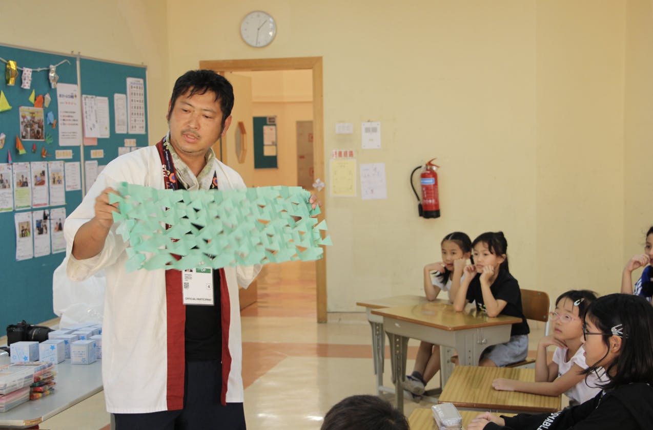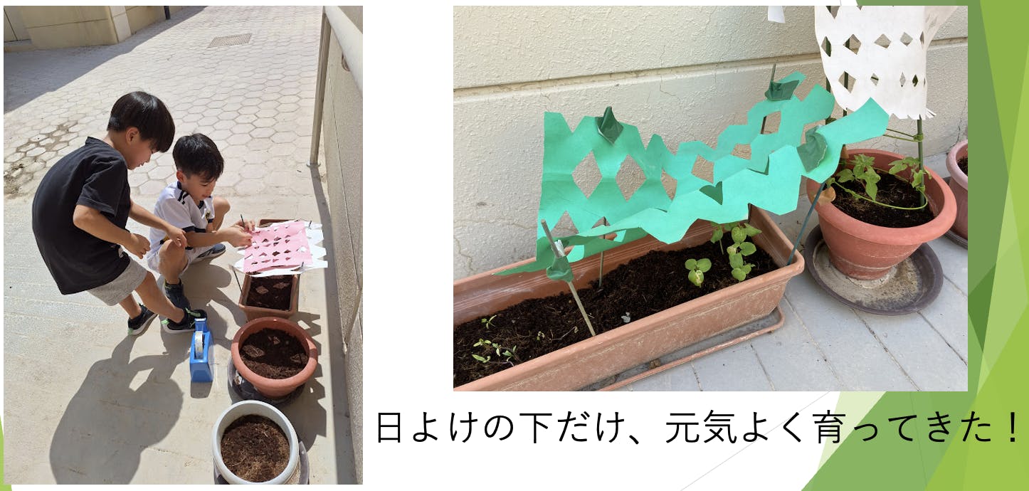 折り紙でも作れると教えてもらったので実際に作ってみました。植物は少し育ちましたが、折り紙の日よけが暑さですぐに痛んで壊れてしまいました