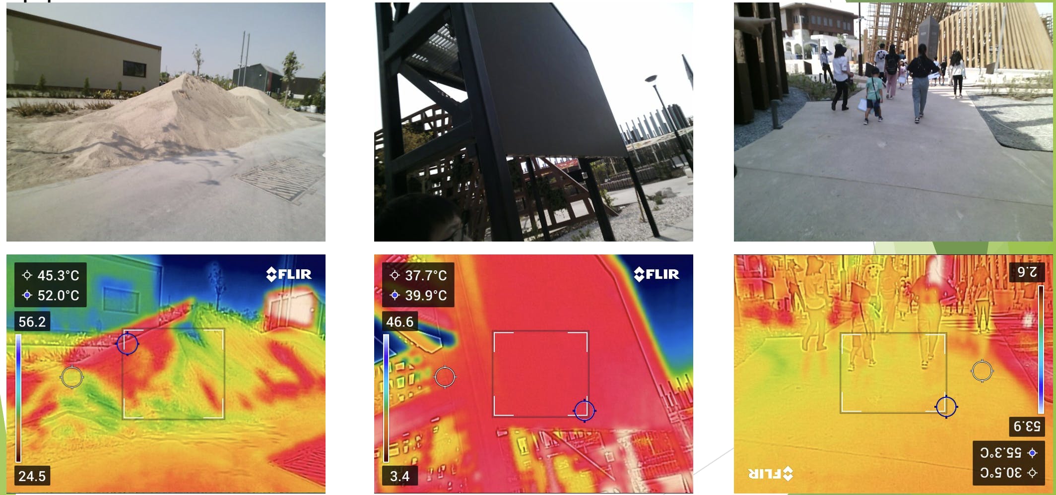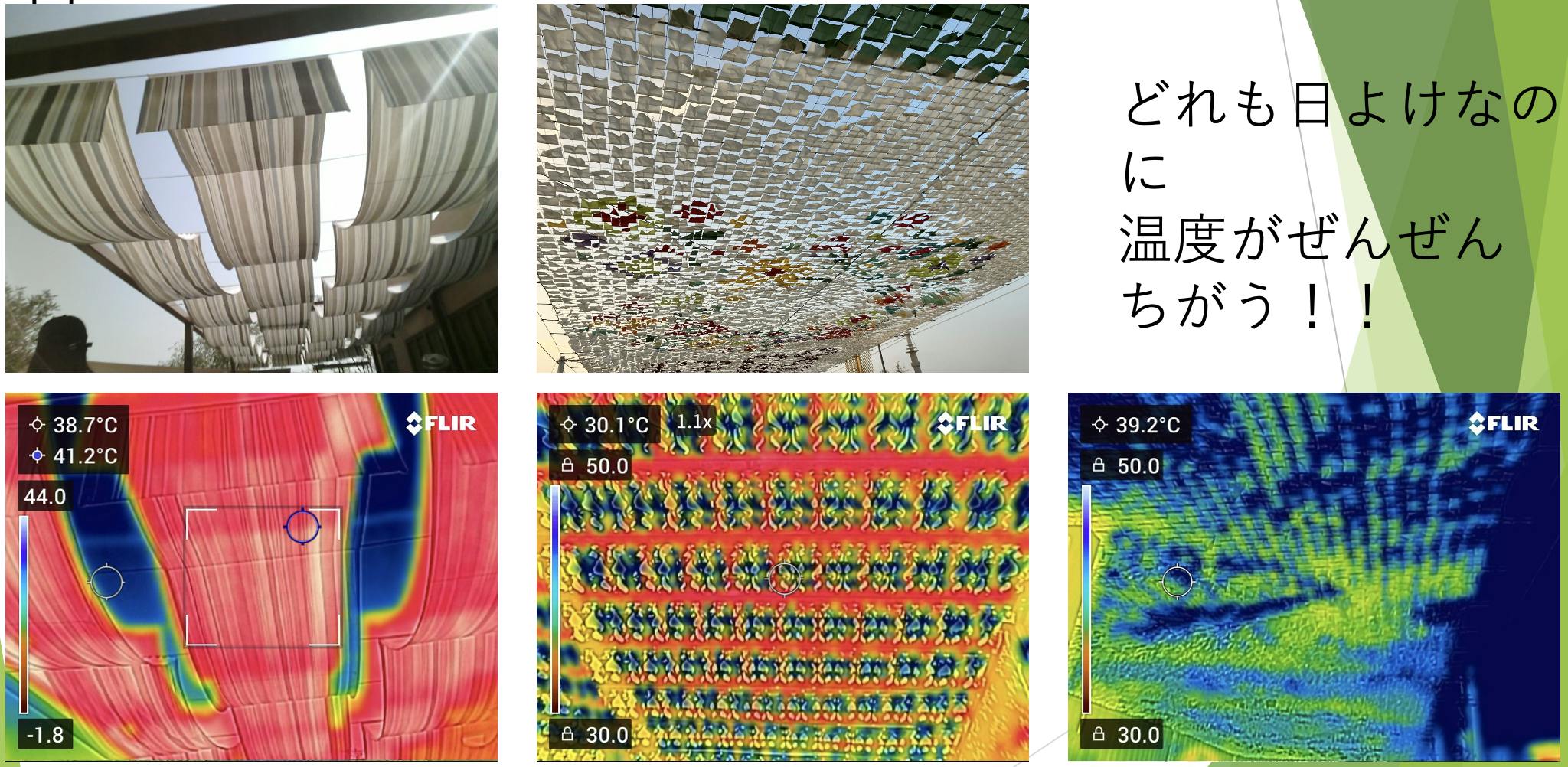 外国のパビリオンでも日よけは使っていますが、サーモグラフィーカメラで温度を計ってみても、あまり涼しくありません。同じ日よけでもこんなにも差があることに驚きました。