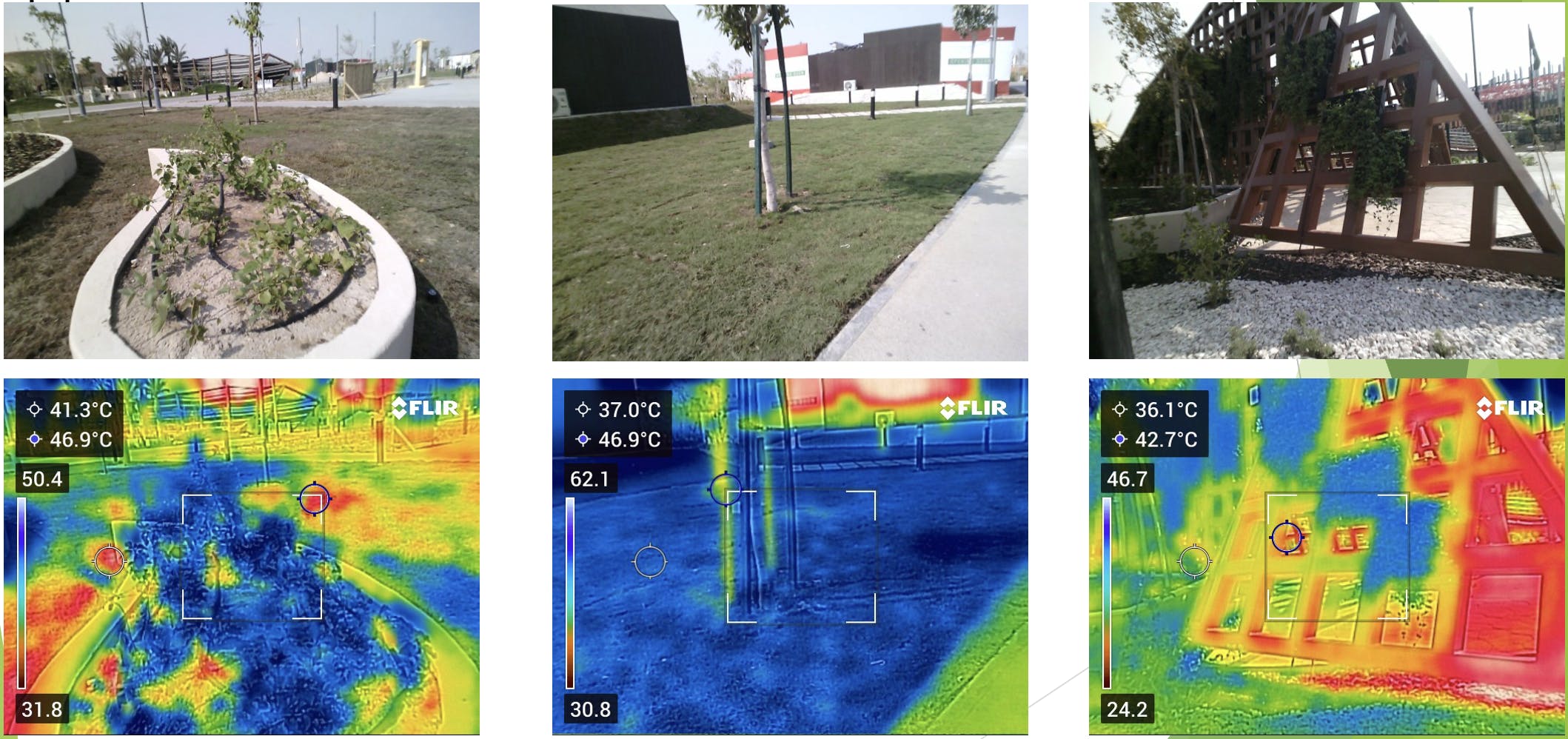 サーモグラフィーカメラで撮るとや鉄でできている部分はすごく暑いことが分かります。だからすずしいわけではありません。また、はないけどすずしい場所もあります。これらの共通点は、緑があるかどうかです。「緑をふやすことで温度が下がり花が育ちやすくなるのではないか」と私たちは仮説を立てました。