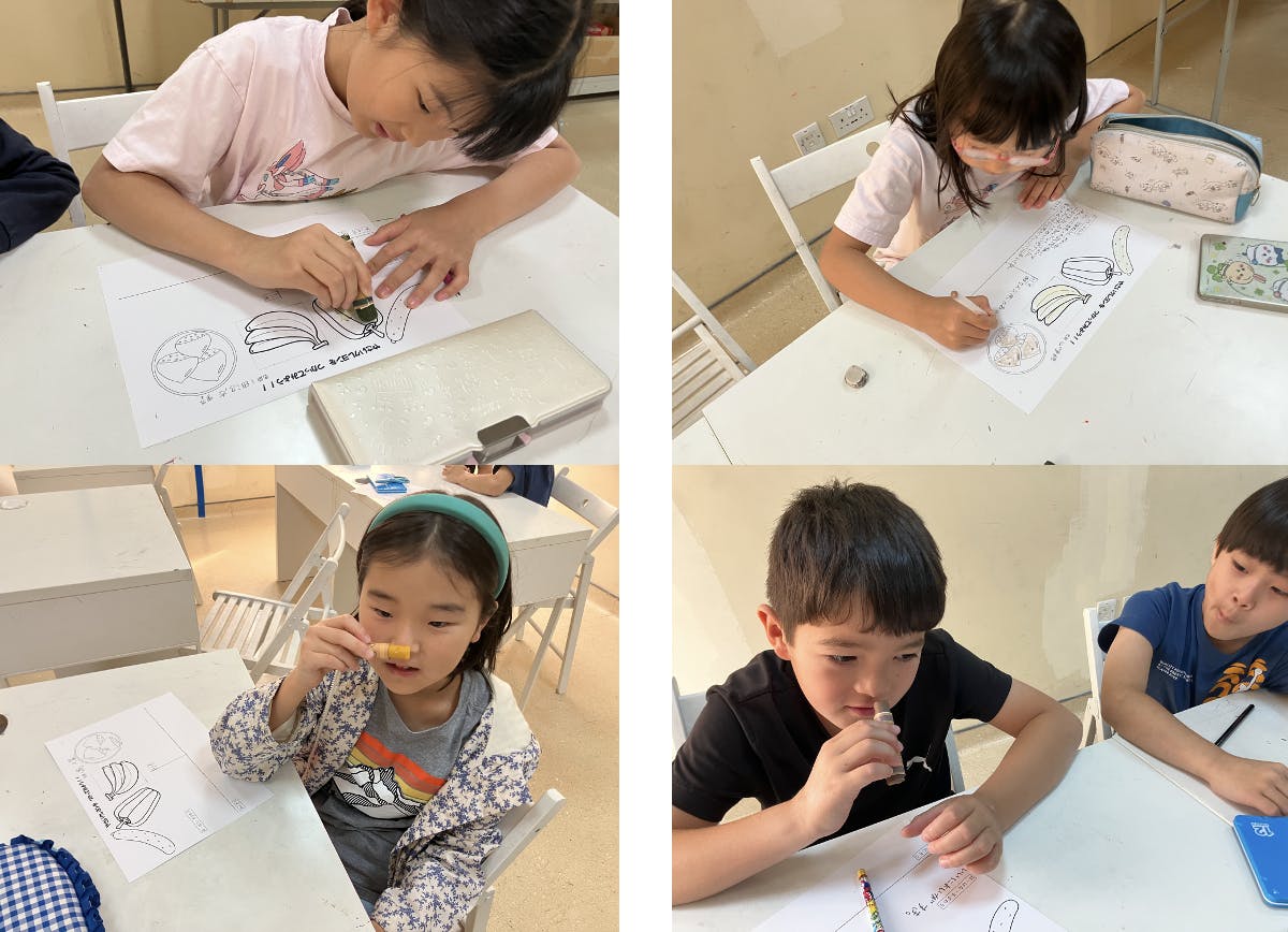 3、4年生は図工の時間を使って試しに色塗りをしました。そんなに力を入れなくてもきれいにぬれました。どれもうすい色でとてもかわいかったです。においも、食べられるのかなと思うぐらい、いいにおいでした。身近にあるもので作れるなんてすごいですね!みかんのかわが、オレンジ色ではなくて黄色になったのがびっくりしました。いちごだったら赤とかピンクが作れるのかな?と思いました。