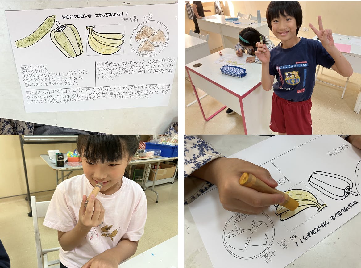 ふつうのクレヨンよりやわらかくて、とてもかきやすかったです。野菜から色が出てクレヨンになるなんて知らなかったので、とてもいい経験になりました。このクレヨンを作った理由が、「もったいない」をへらすためと聞きました。ごみになってしまうようなものが、みんなが楽しくつかえるものにへんしんするのが、すごくいいなと思いました。