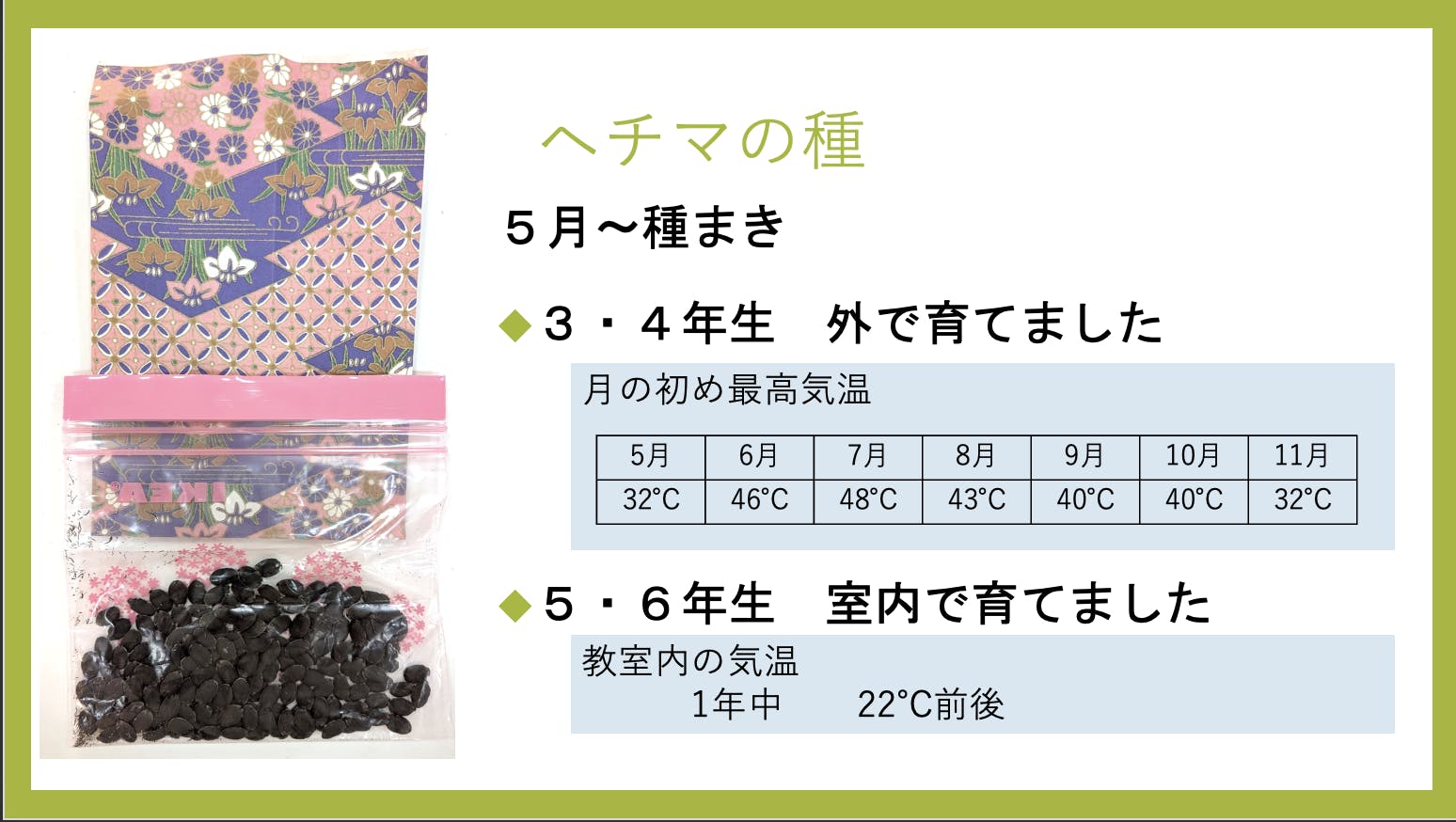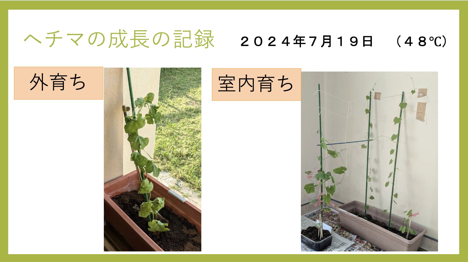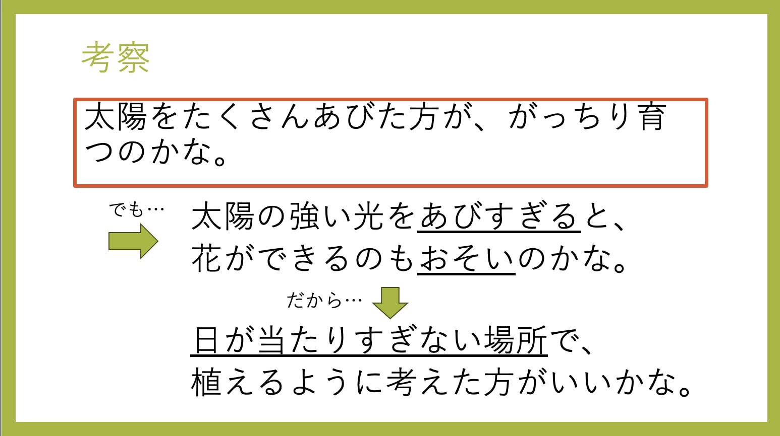 この結果からわたしたちは、太陽に直接当てた方が、力強いけれど、太陽をたくさんあびてしまうとかれやすく、花もさくのがおそいというのかなと考察しました。