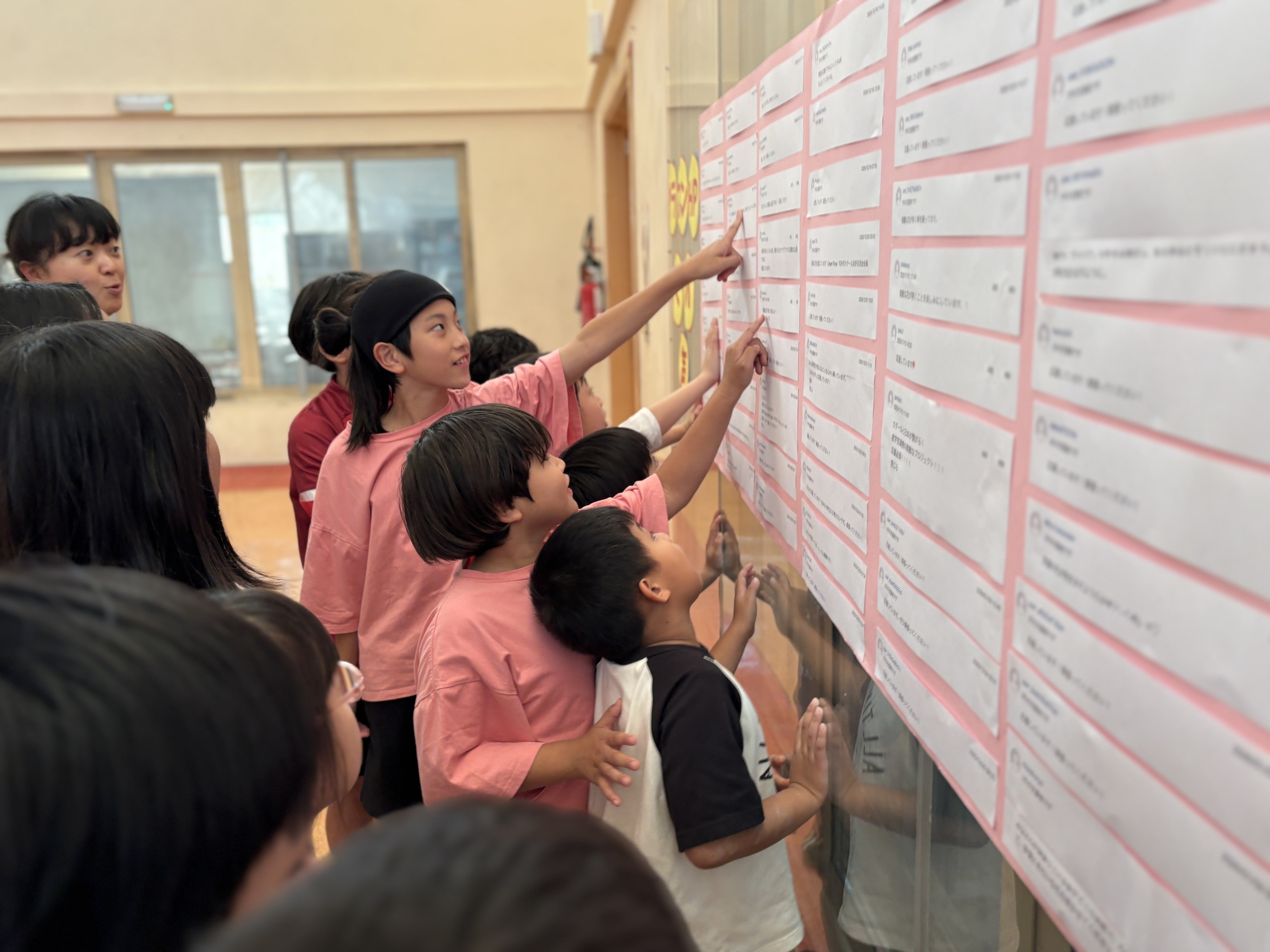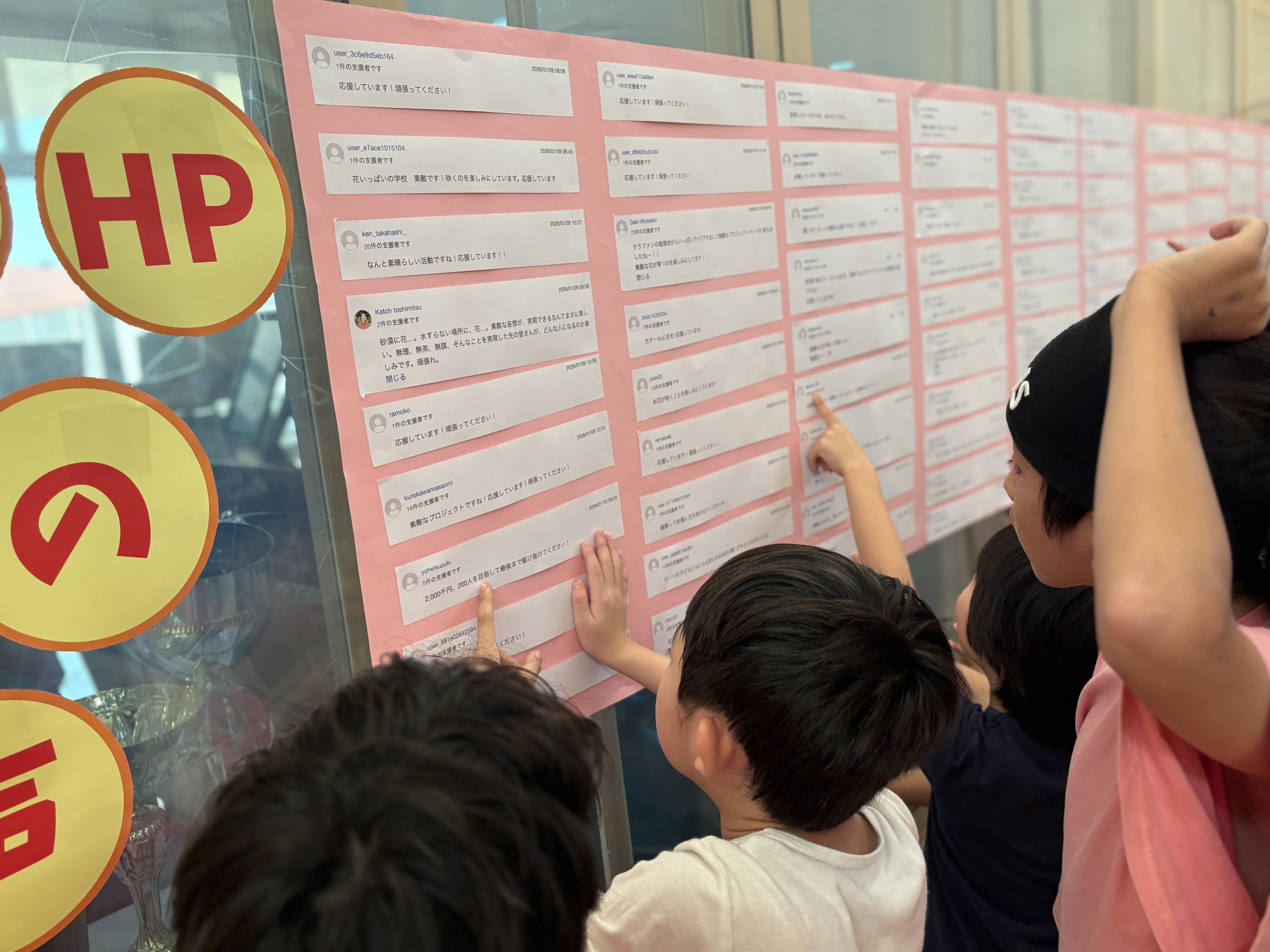 ホールに貼り出された100件以上の応援メッセージでした。