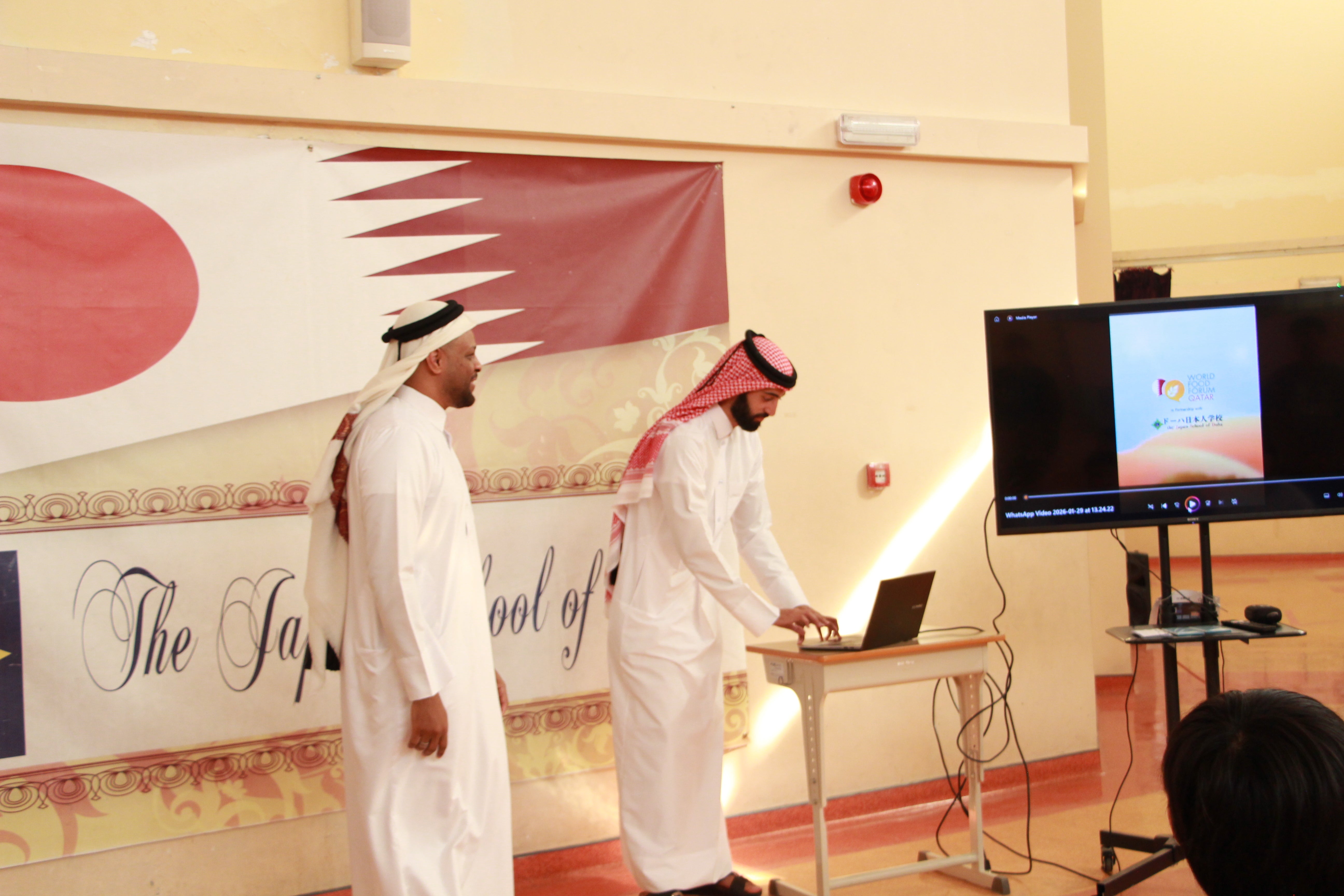 SNS班のメンバーで、一生懸命練習した英語で歓迎の言葉を伝えました。お礼の挨拶もして、みんなでカタールと日本の国旗をバックに記念撮影をしました。