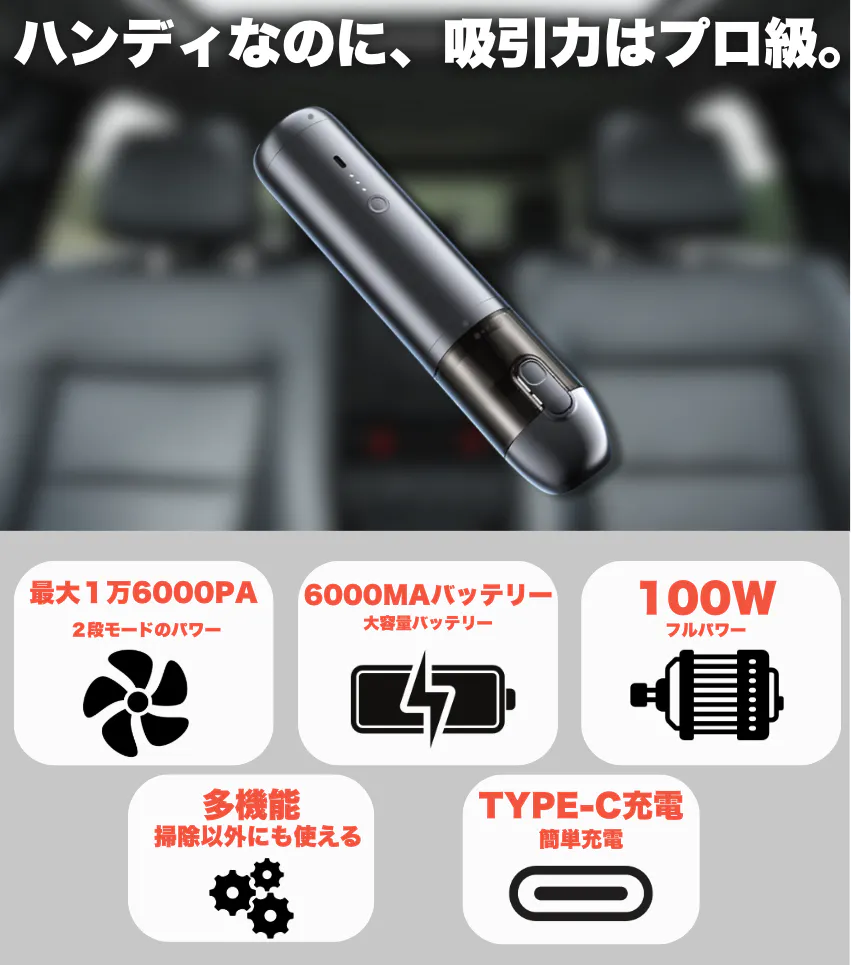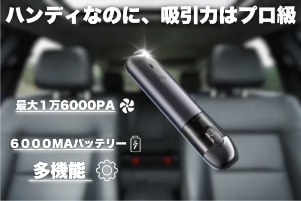 市販のハンディ掃除機では満足できなかった方にこそ使ってほしい。この製品には、最大1,6000Paのハイパワーモーターが内蔵されています。