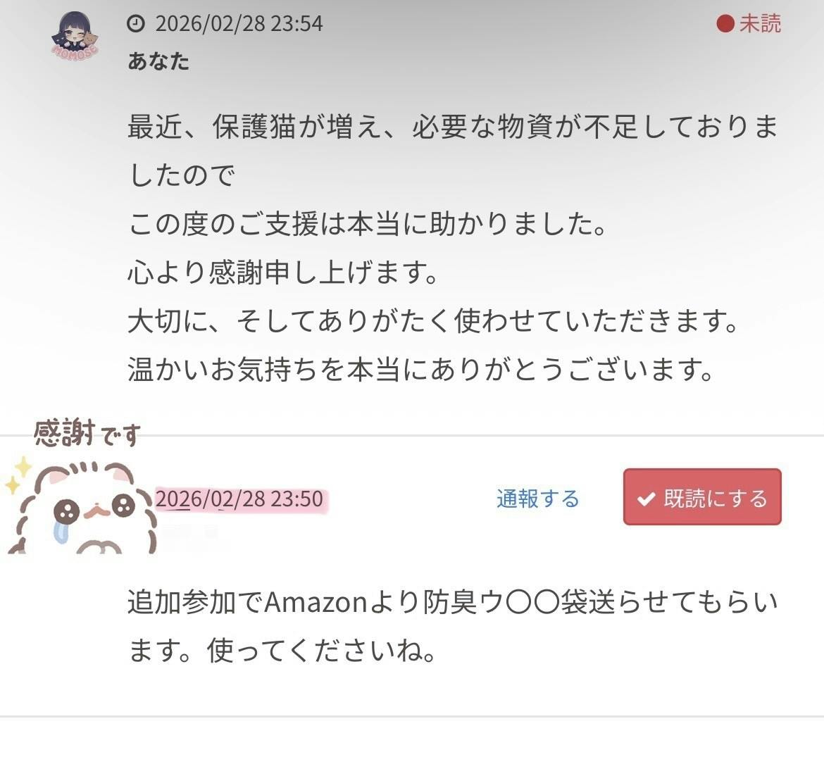 2026/03/01 11:00最近、保護猫が増え、必要な物資が不足しておりましたのでこの度のご支援は本当に助かりました。心より感謝申し上げます。大切に、そしてありがたく使わせていただきます。温かいお気持ちを本当にありがとうございます。Amazonほしいものリストを公開しております。 地域猫さん、さくら猫さん、保護猫、 そしてスキンシップボランティアで関わっている犬たちのために 必要な物資を掲載しています。 無理のない範囲で、 お力を貸していただけたら嬉しいです。 ▼こちらをタップ もっと見る