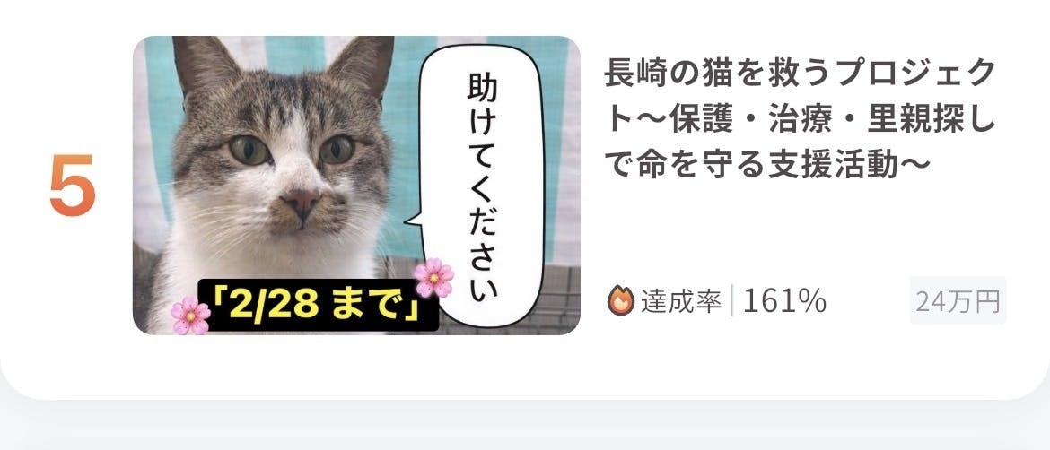2026/03/01 12:00クラウドファンディングが無事終了いたしました。最後まで見守り、応援してくださった皆さま、本当にありがとうございました。ご支援・拡散・温かいお言葉、どれも大きな力になりました。皆さまのおかげで、保護猫たちに必要な医療や物資を届けることができます。一人ではできないことを、みんなで形にできたことに心から感謝しております。これからも活動報告をしっかり行ってまいります。本当に、本当にありがとうございました。 もっと見る