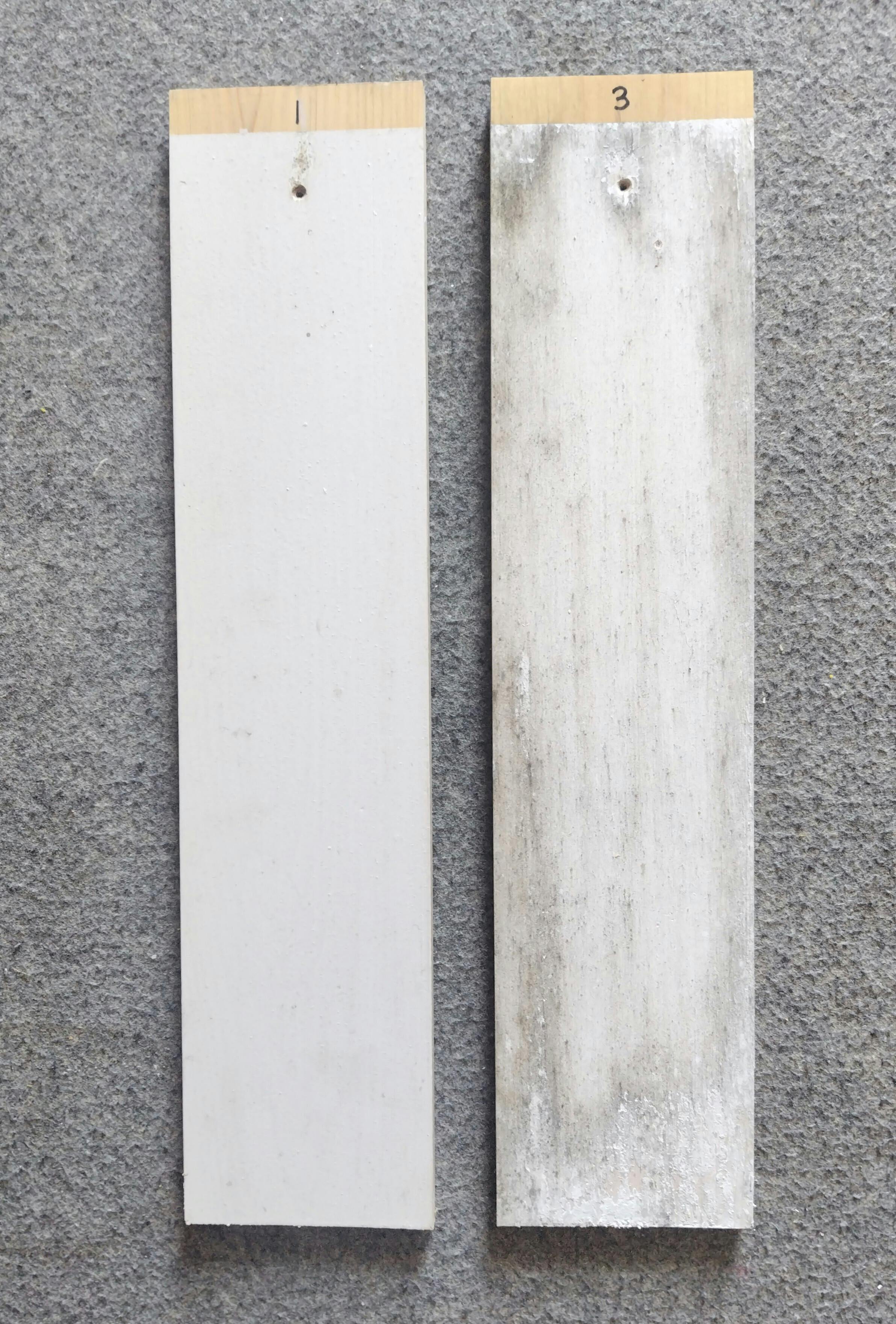画像右は未処理膠を使った胡粉膠塗料。左は植物ポリフェノールで耐水性抗菌性にした膠を使った胡粉膠塗料。右はカビが繁殖しています。耐水性抗菌性膠を使用して稲荷社を彩色します。