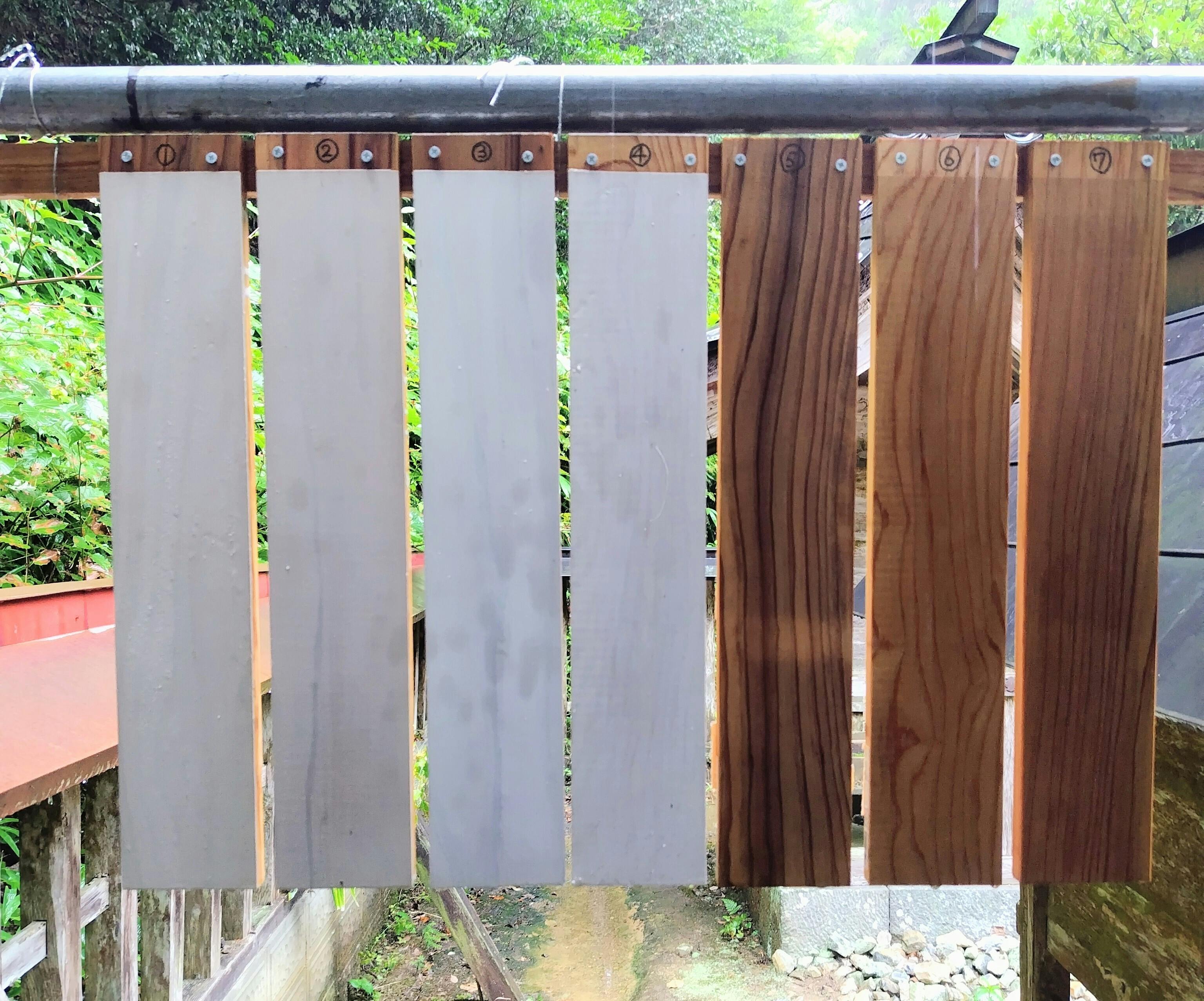 稲荷社は海岸近くにあり、雨風や塩害の影響を受けます。そのため、通常の膠を植物ポリフェノールを使用して耐水性抗菌性にした膠の絵具塗料で稲荷社を彩色します。写真は膠液及び膠胡粉塗料の曝露試験をしているところ。
