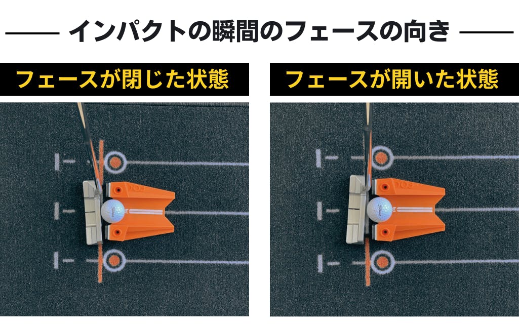 フェースが開いていたり閉じていると、パターの両端が同時にインパクトパッドに触れず、ズレが即座に明確になります。