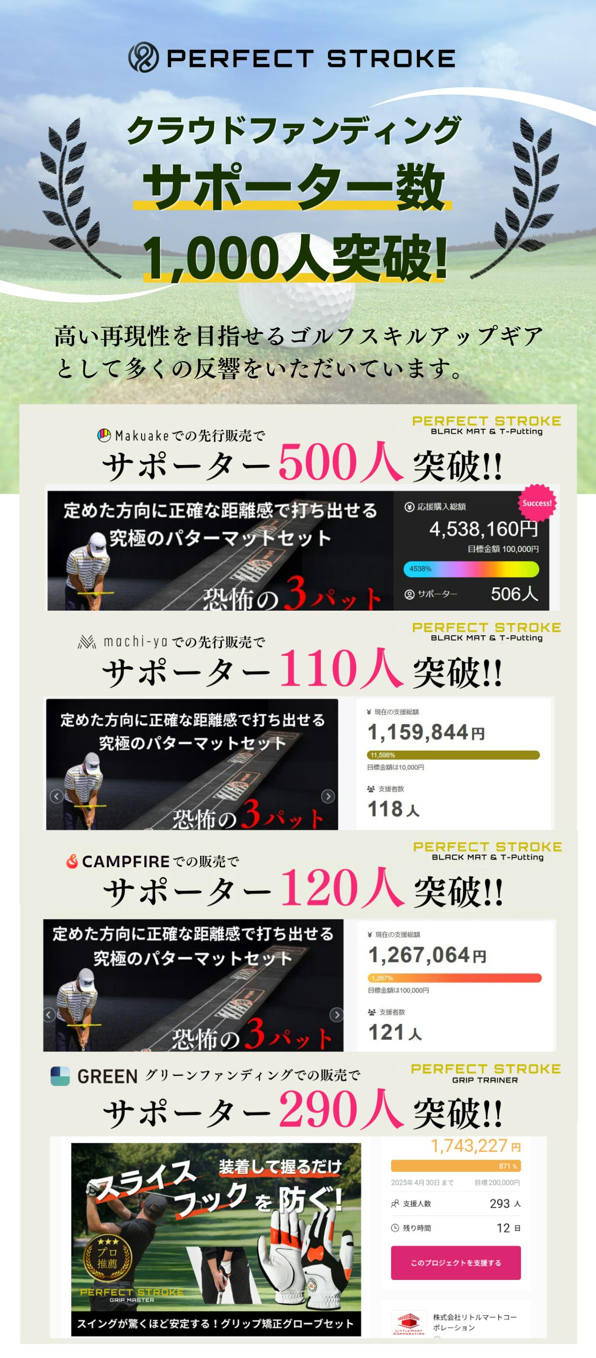 2025/09/01 11:02この度は、パッティング練習器具 「the Putt」のクラウドファンディングにご支援購入いただき、誠にありがとうございました。皆さまのお力添えにより、最終的に達成率268% という成果を収めることができました。心より御礼申し上げます。現在、製品はすでにメーカーの方に発注済みであり、到着次第、順次発送の手配を進めてまいります。進捗状況については、こちらの活動レポートを通じて随時ご報告いたしますので、どうぞご安心ください。「the Putt」は、「芯で打つ」「狙った方向に打つ」というパッティングの本質を鍛えるために開発された練習器具です。地道な練習ではございますが、ぜひ日々の継続した練習に取り入れ、スコアアップにつながる確かなパッティング力を身につけていただければ幸いです。また、10月からは一般販売に向けた準備も進めております。クラウドファンディング終了後も、より多くのゴルファーの皆さまに「the Putt」をお届けできるよう努めてまいります。私たち PERFECT STROKE(パーフェクトストローク) は、これからもゴルファーの皆さまの成長をサポートするスキルアップ用品を開発・展開してまいります。今後とも変わらぬご支援をよろしくお願いいたします。誠にありがとうございました。 もっと見る【Yahoo!ニュースにも掲載!】the Putt & the Markプロジェクト、残り9日!達成率198%突破しました!