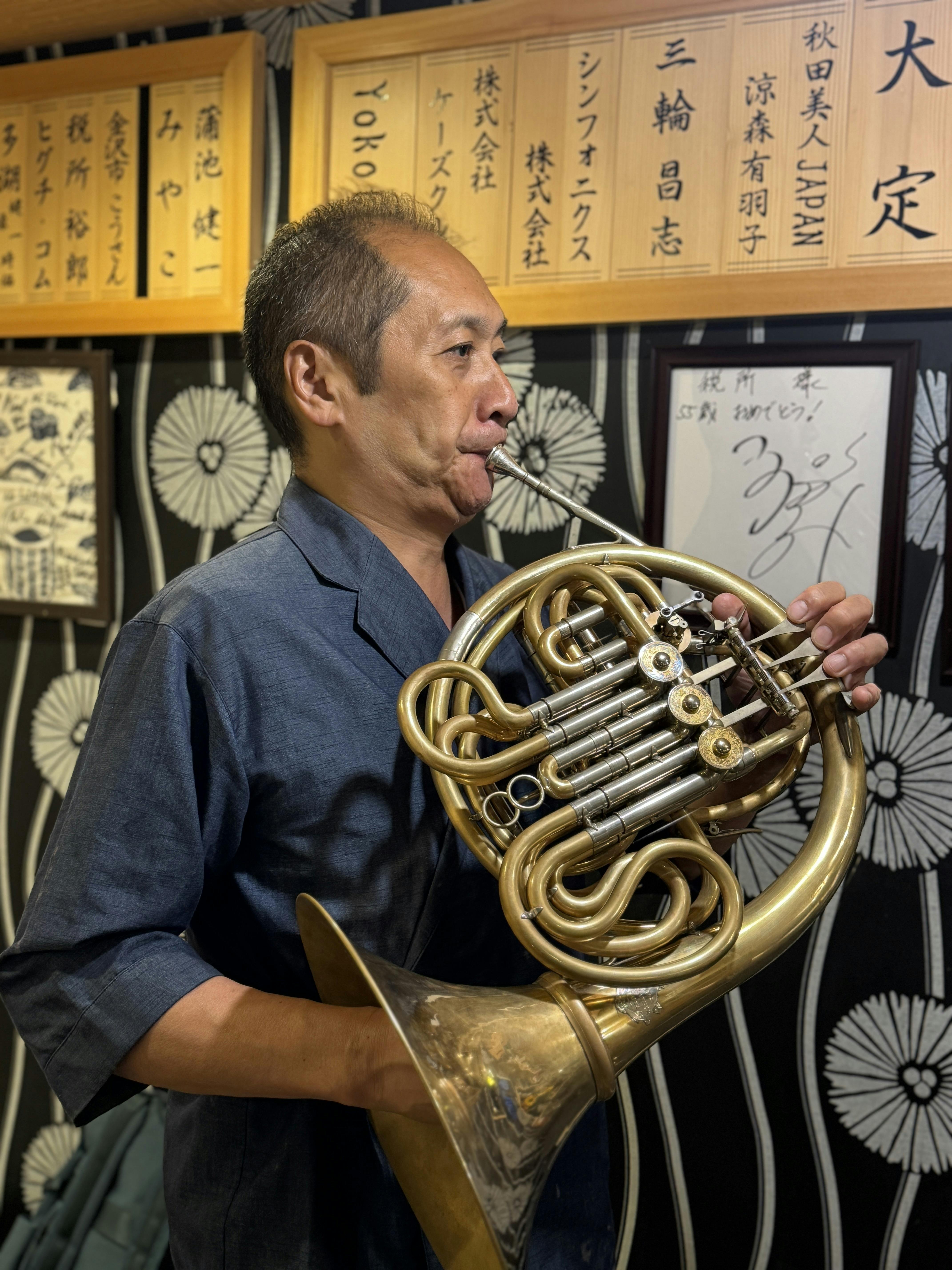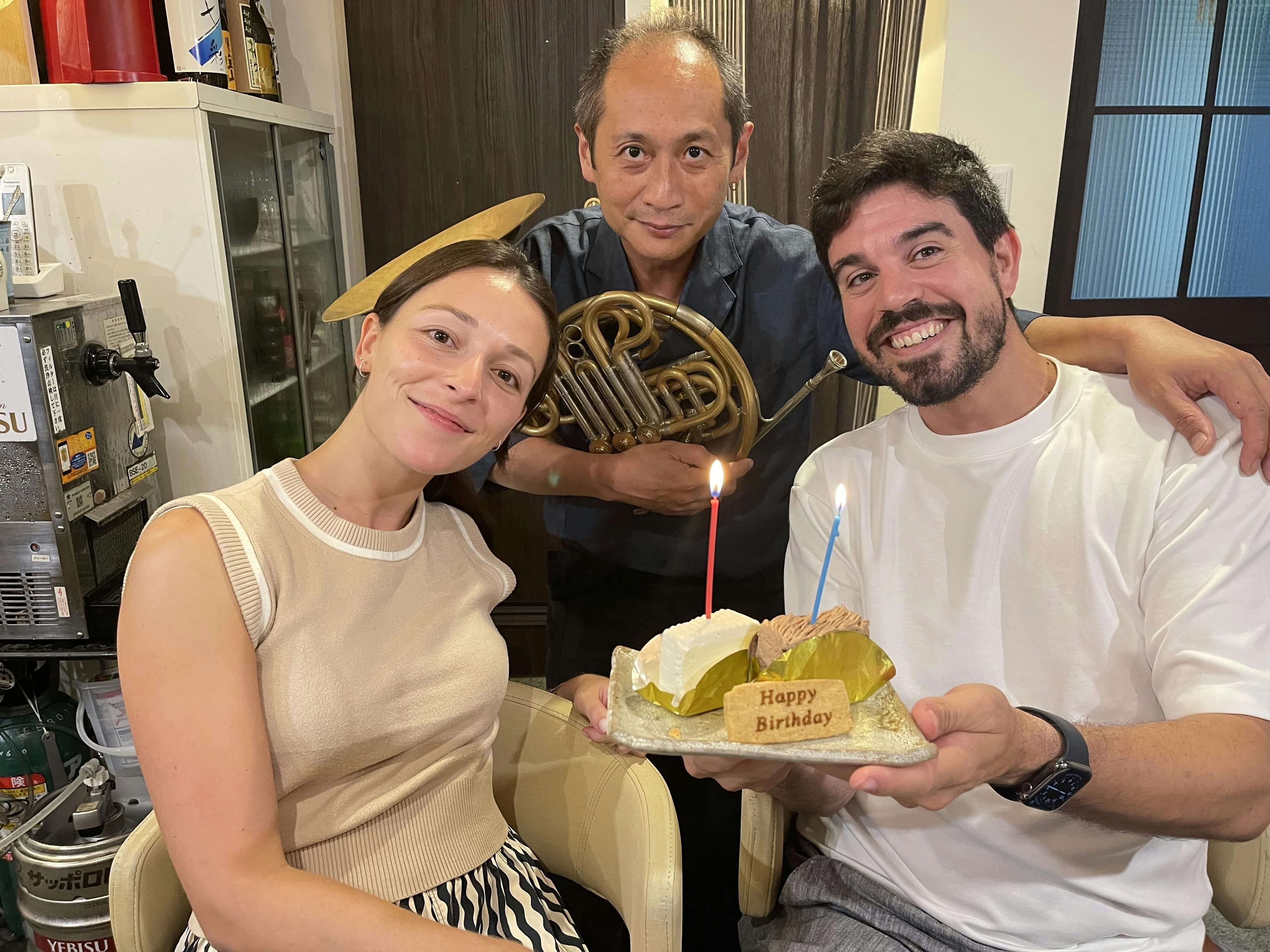 ハネムーン&誕生日のお祝いにケーキとホルンの生演奏バースデーソングでサプライズ創業時の大井町時代や銀座に移転してきてからのお馴染みの方々等本当に沢山のお客様に支えられ、なんとか再移転後のこの3年間を無事に乗り越えてこれました。