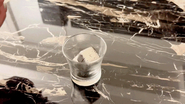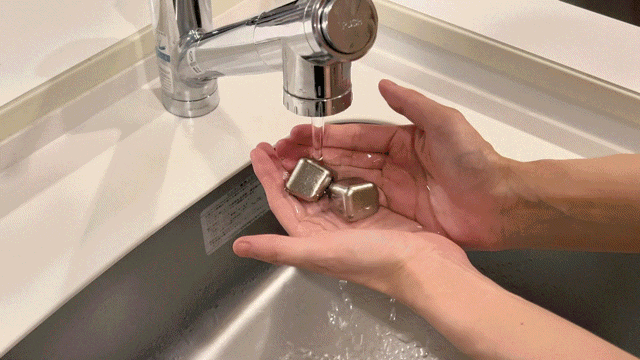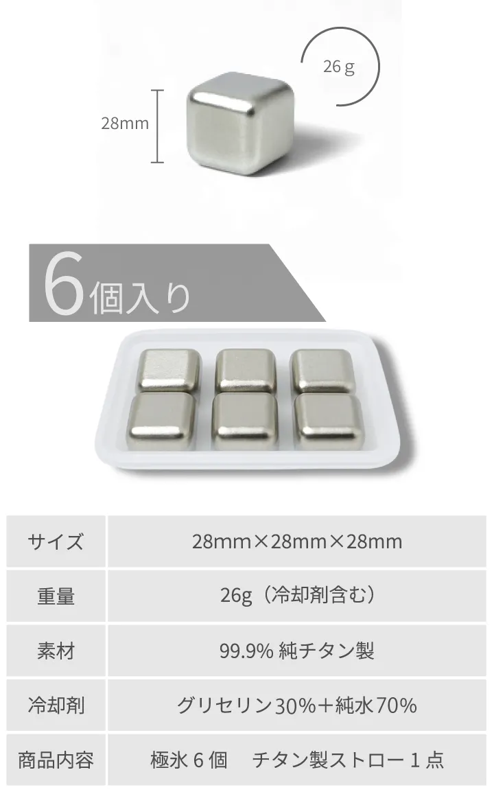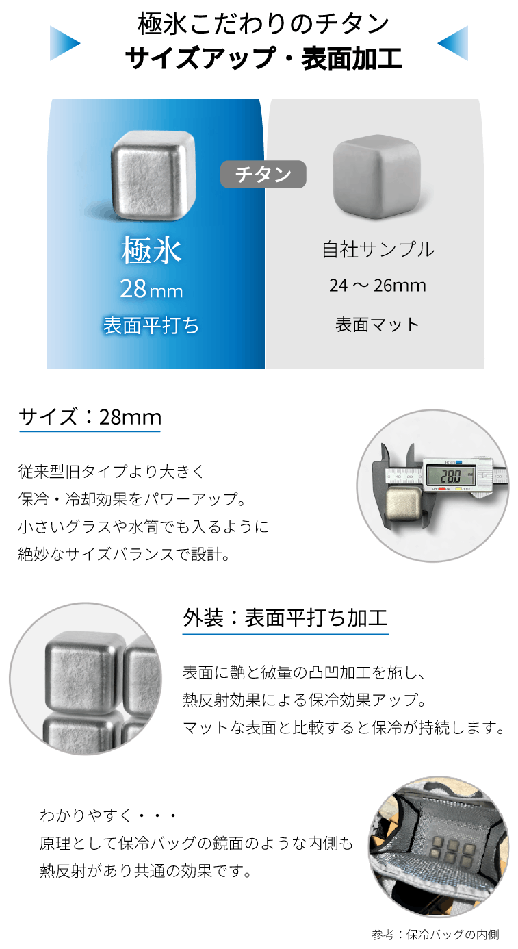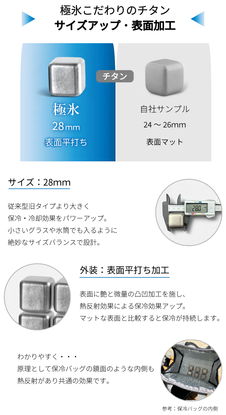 チタン素材を使用したアイスキューブは既にありますが、極氷はさらにサイズを大きくするとともに表面加工に変化を加えました。 サイズを大きくする事と表面をあえて凹凸のある平打ち加工にする事で保冷・冷却効果を高めています。