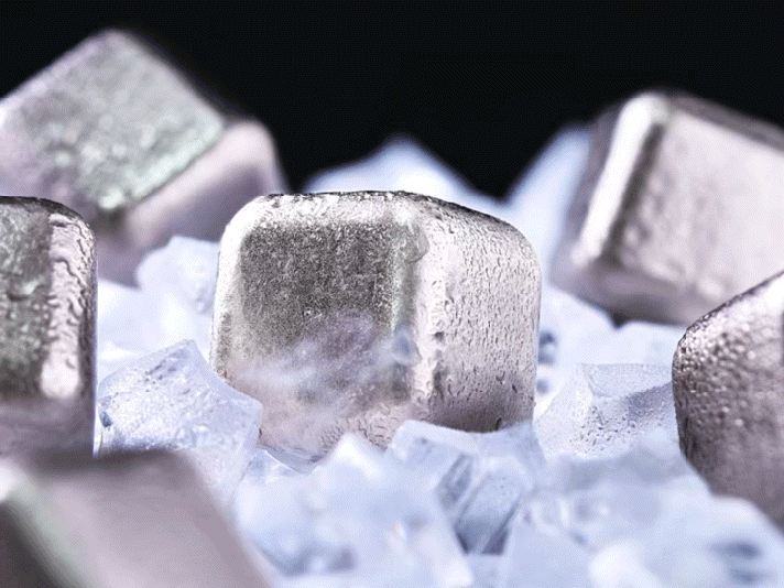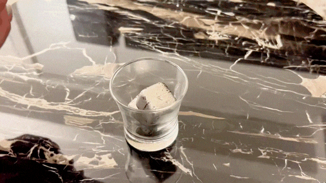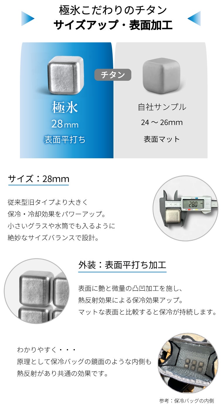 チタン素材を使用したアイスキューブは既にありますが、極氷はさらにサイズを大きくするとともに表面加工に変化を加えました。 サイズを大きくする事と表面をあえて凹凸のある平打ち加工にする事で保冷・冷却効果を高めています。