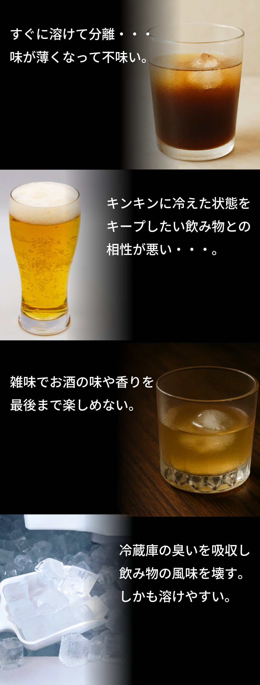 プラスチックやステンレス製では冷蔵庫の匂い移りや耐久性に弱点があり、石を使った氷などでも冷却力には物足りなさがあります。