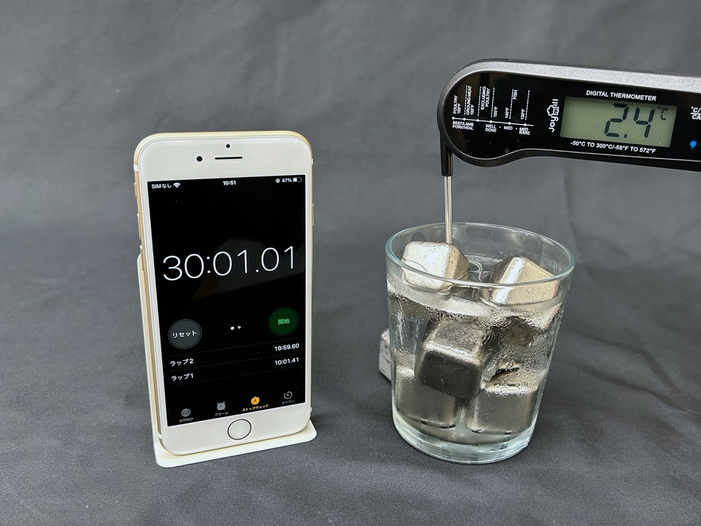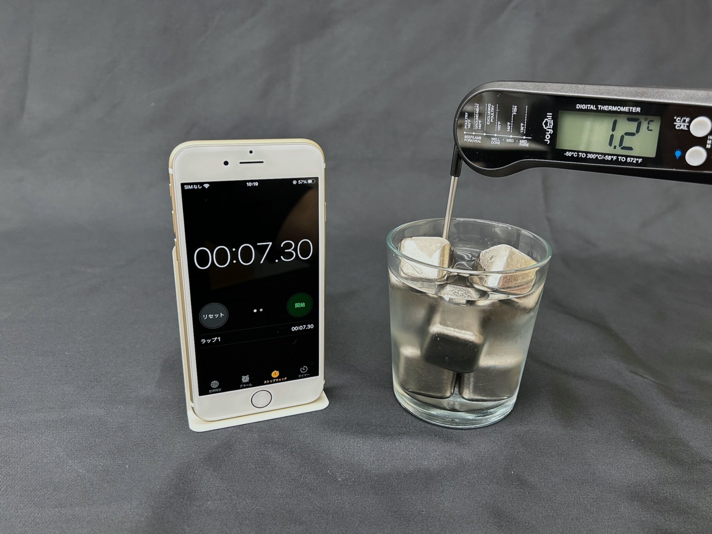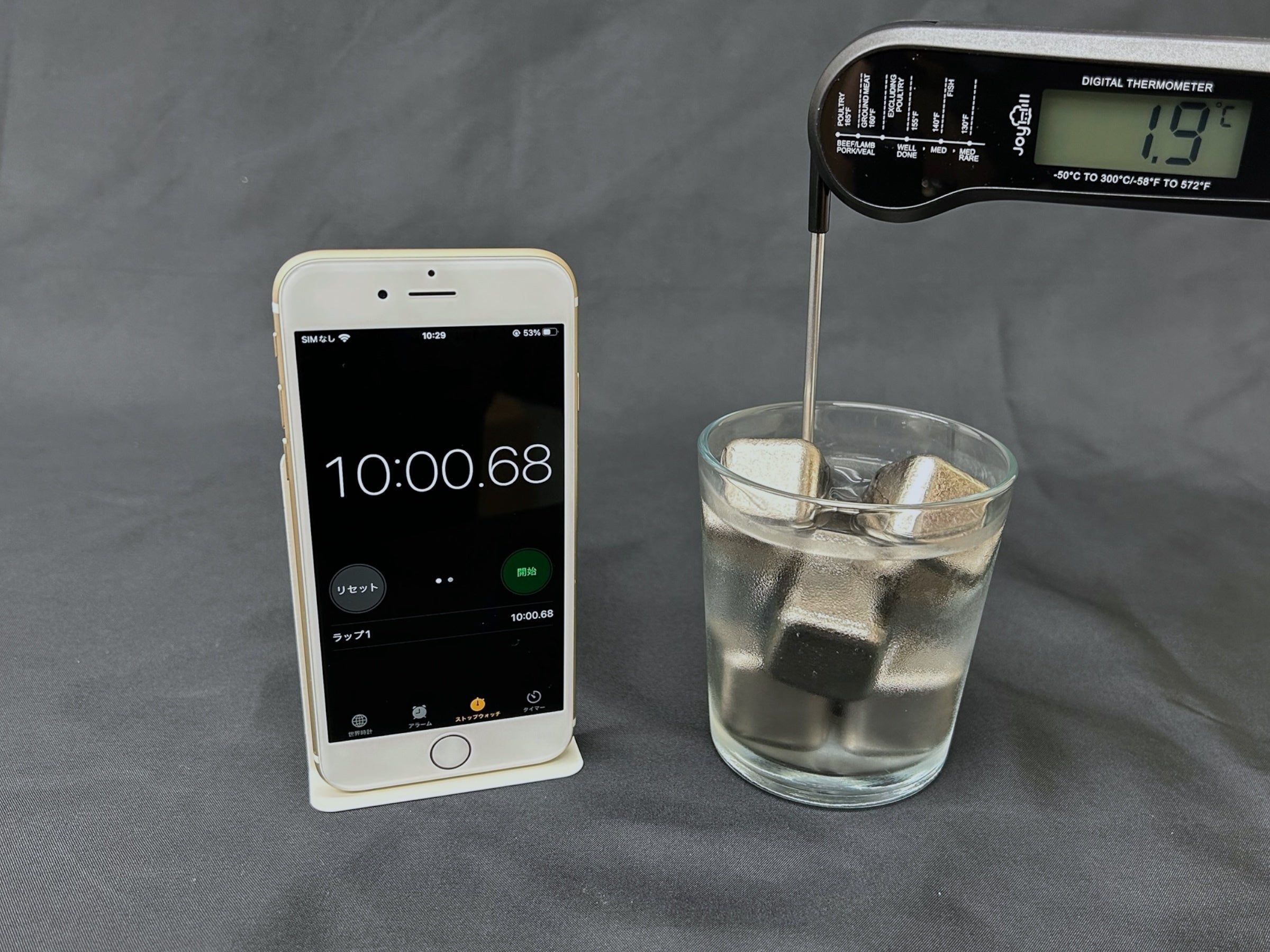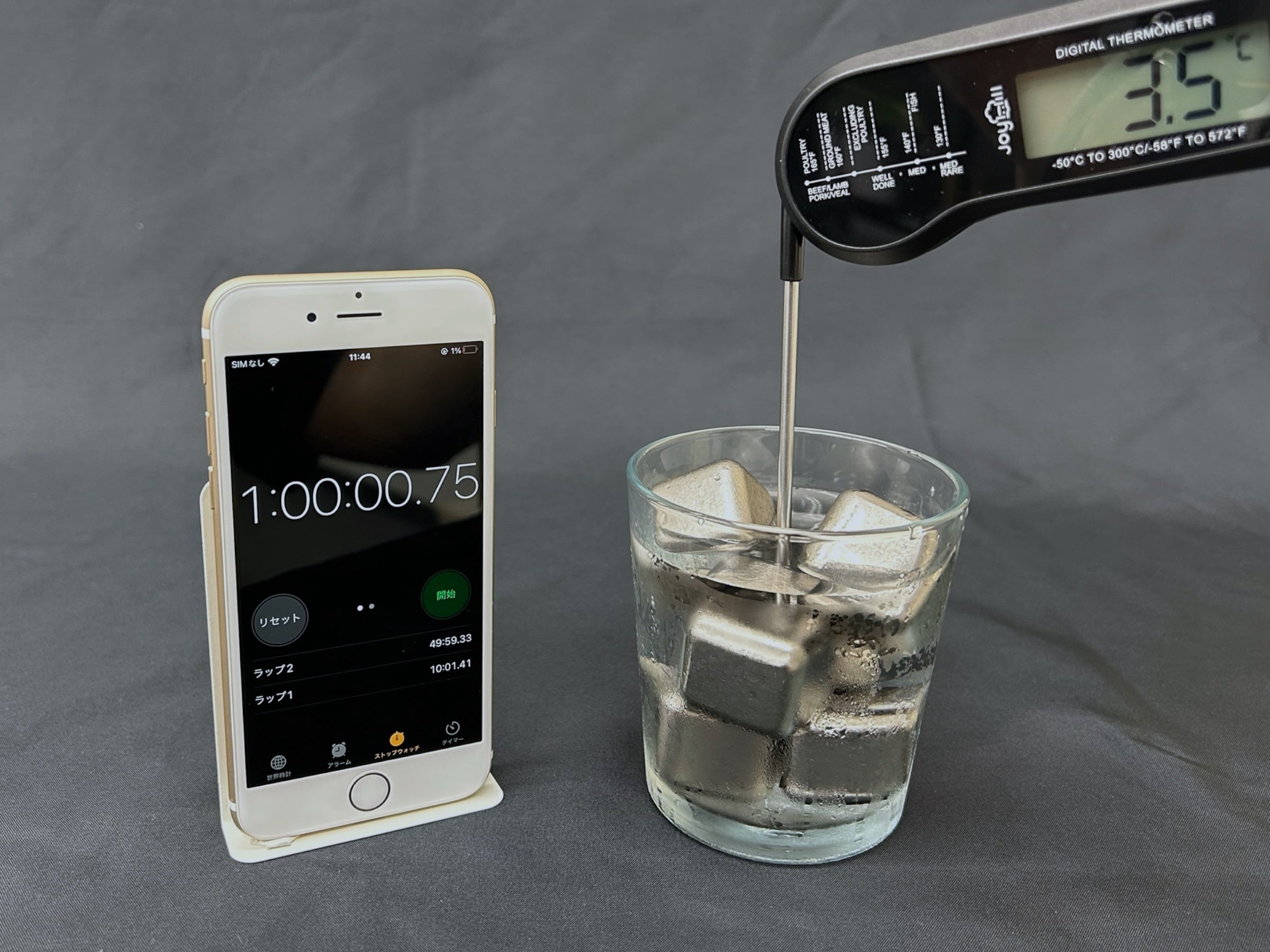 水に極氷を入れてしっかりステアして冷やし、その後どのくらい冷たさが持続するのかをテストします。