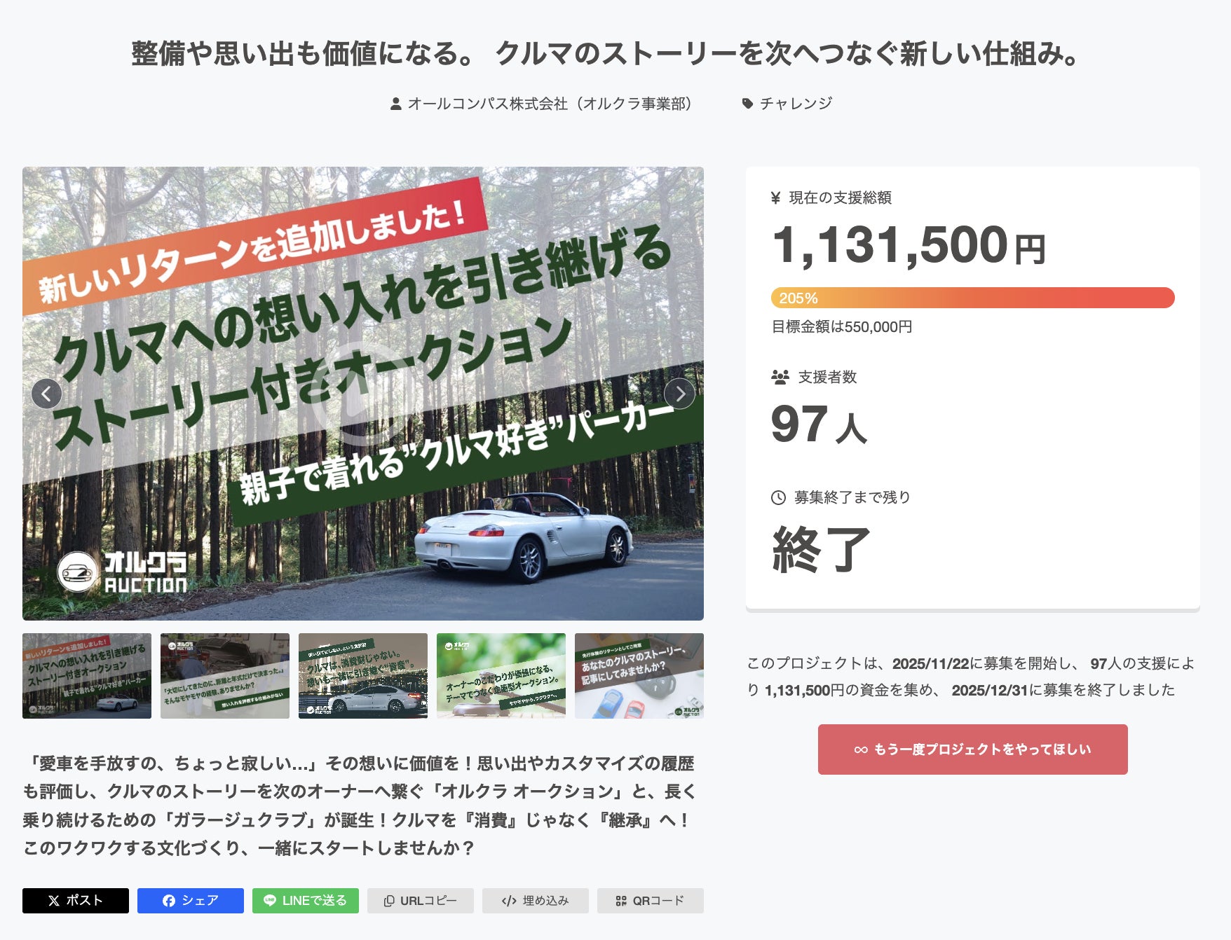 2026/01/05 12:30あけましておめでとうございます。オルクラを応援してくださった皆さま、本当にありがとうございます。昨年の大晦日を最終日として設定していたオルクラのクラウドファンディングは、当初目標として掲げていた55万円の目標を2日で達成したのち、ネクストゴールとして設定した110万円も超え、最終的に1,131,500円で終了することができました。まずはこの結果を、心からの感謝とともにご報告させてください。お約束していた機能について今回のクラウドファンディングでお約束していた「オーナーズノート」機能については、すでに実装が完了しています。クルマを大切にしてきた時間やエピソードを記録し、そのクルマの“背景”まで含めて残せる場所として、少しずつ形になり始めています。新たに実装した機能について加えて、今回の開発の中で、新たに「マイカーアーカイブ(3Dモデリング)」機能も実装しました。これは、オーナーズノートの考え方をさらに一歩進め、「今、この状態のクルマを立体的に残す」ことを目的としたものです。写真や文章だけでなく、クルマそのものを3Dでアーカイブすることで、より実感のある“記録”として残せるようになりました。当初の想定を超えて、オルクラが目指している「クルマを楽しみ、残し、次につなげる」体験に近づけたと感じています。最後に今回のクラウドファンディングは、リターンとして分かりやすいモノや派手な特典を前面に出したものではありませんでした。それでも、当初目標を超え、さらにネクストゴールを上回る形で支援が積み重なったことは、この考え方に共感してくれる仲間がこのクラファンだけでも97名の方々が確かにいる、という事実だと受け止めています。この結果はゴールであると同時に、スタートラインでもあります。ここからは、実装した機能を磨き込みながら、「明るくて、楽しいカーライフ」を実感できるサービスとしてオルクラを育てていくフェーズに入ります。新しい一年も、試行錯誤を重ねながらにはなりますが、一歩ずつ、確実に前に進み、一人でも多くのクルマ好き集め、仲間集めをしていきます。本年も引き続き、オルクラをどうぞよろしくお願いいたします。 もっと見る【先行のお知らせ】オーナーズノート/マイカーアーカイブ β版を公開しました