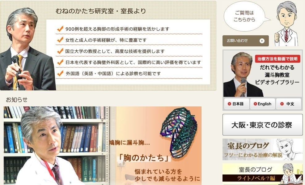 しかし治療をうけるためには、どのような治療(手術)を行うのかを、患者さんご自身が、知らなくてはいけません。そこで私たちはホームページ「むねのかたち研究室」を作成し、運営しています(むねのかたち研究室)。
