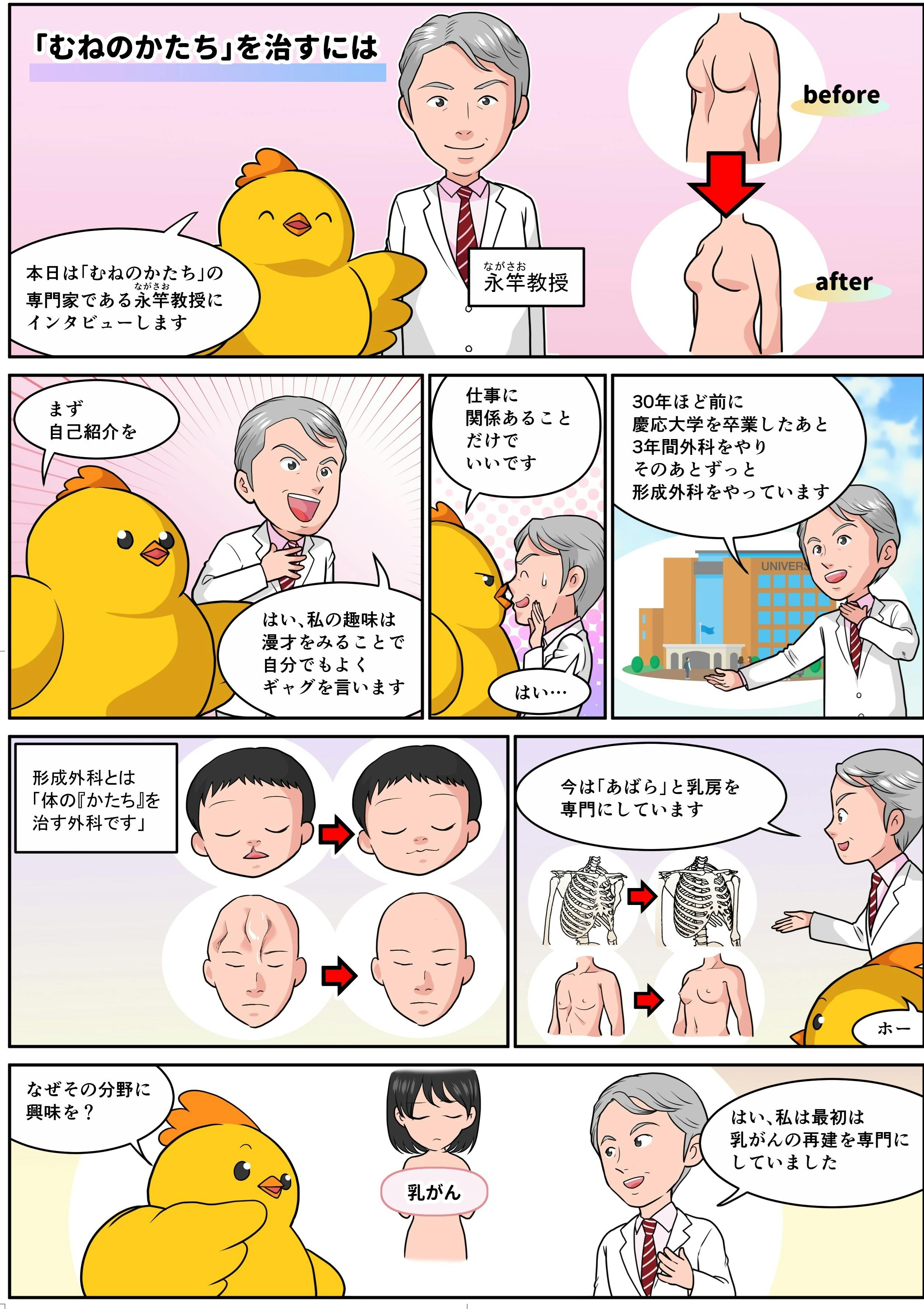 私たちは大学病院に勤める形成外科医です。形成外科とは身体の形を整える診療科です。わたしたちは特に、乳房や「あばら」など、胸のかたちを整える手術に長けています。私たちの診療科では「あばら」の形成手術を、日本でもっとも多く行っています。
