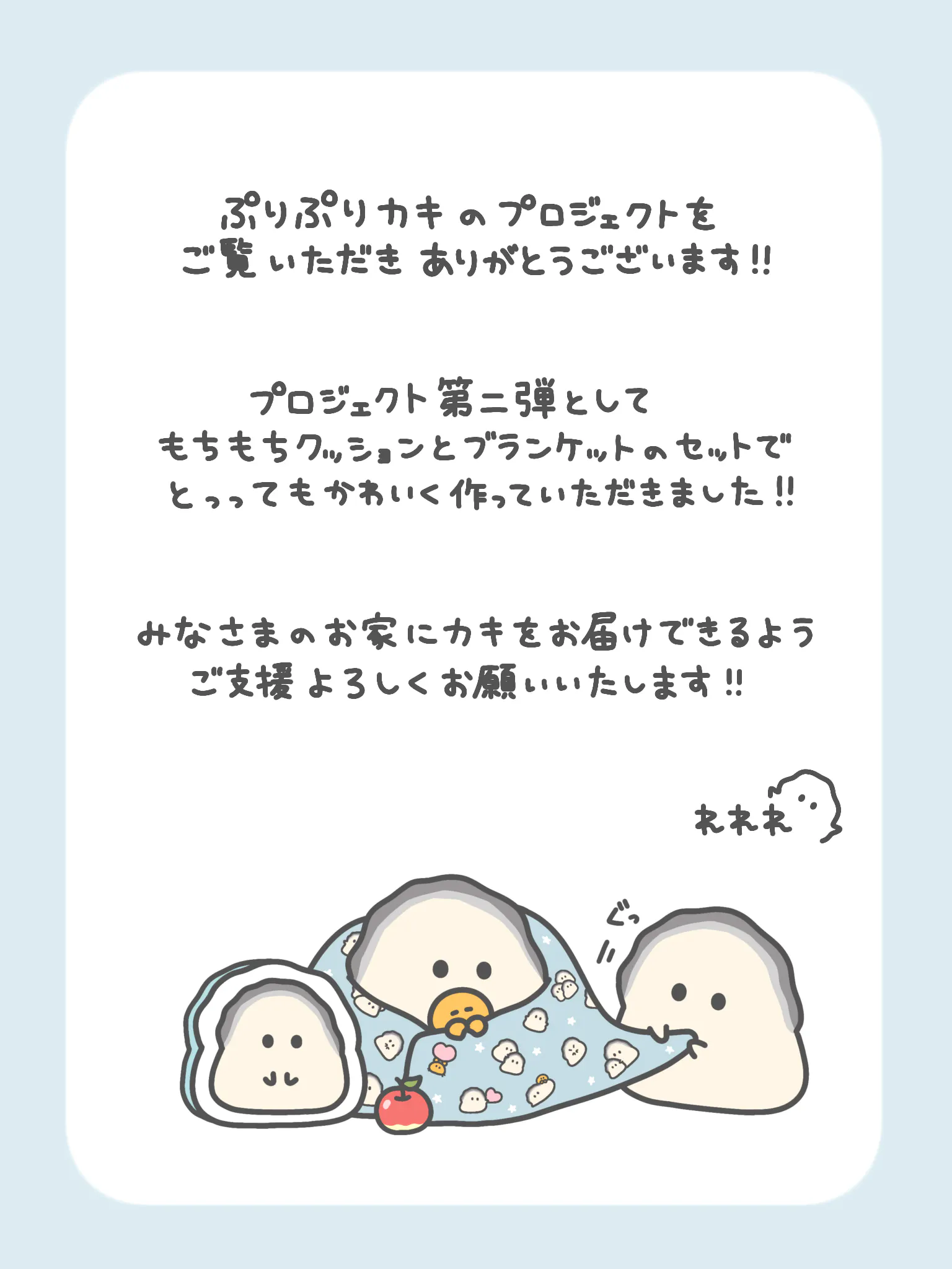 2025/07/22 18:00Creationスタッフです。ぷりぷりカキクッションブランケット化プロジェクトへのご支援ありがとうございます!皆様のたくさんのご支援を記念しまして...【ストレッチゴールを設定しました!】200%達成で支援者様「全員」にクリアファイルをプレゼント!クラファン限定デザインですのでぜひご支援お願いします!!クラファン期間は【8月3日(日)23:59】まで!ぜひこの機会に応援よろしくお願いします!! もっと見る