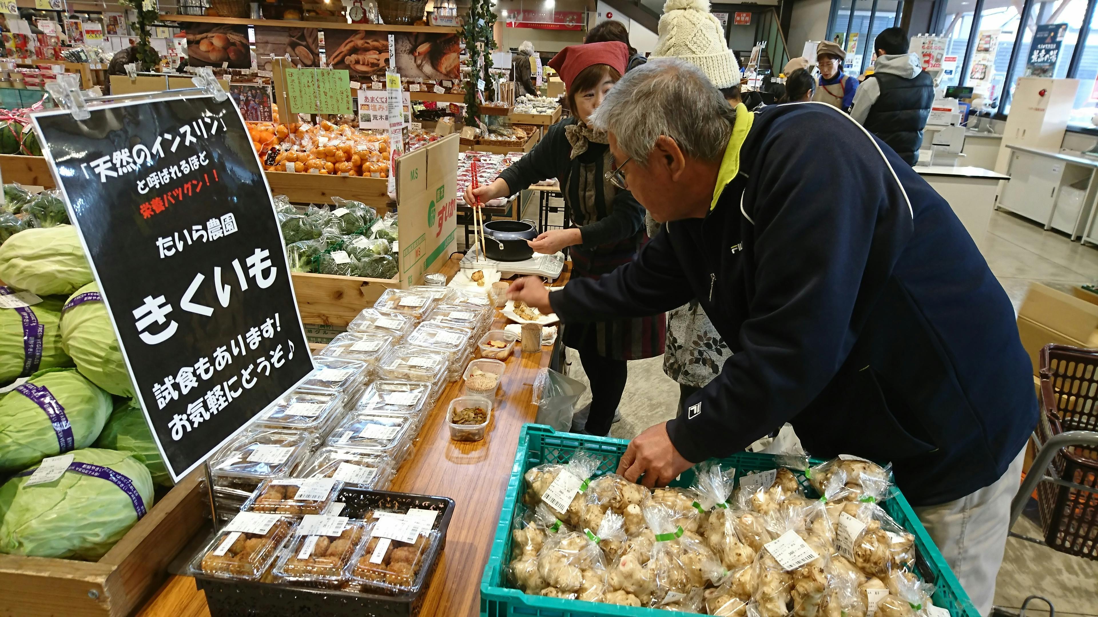 菊芋の販促活動はもちろんですが、新しく作った菊芋商品を試食してもらい、