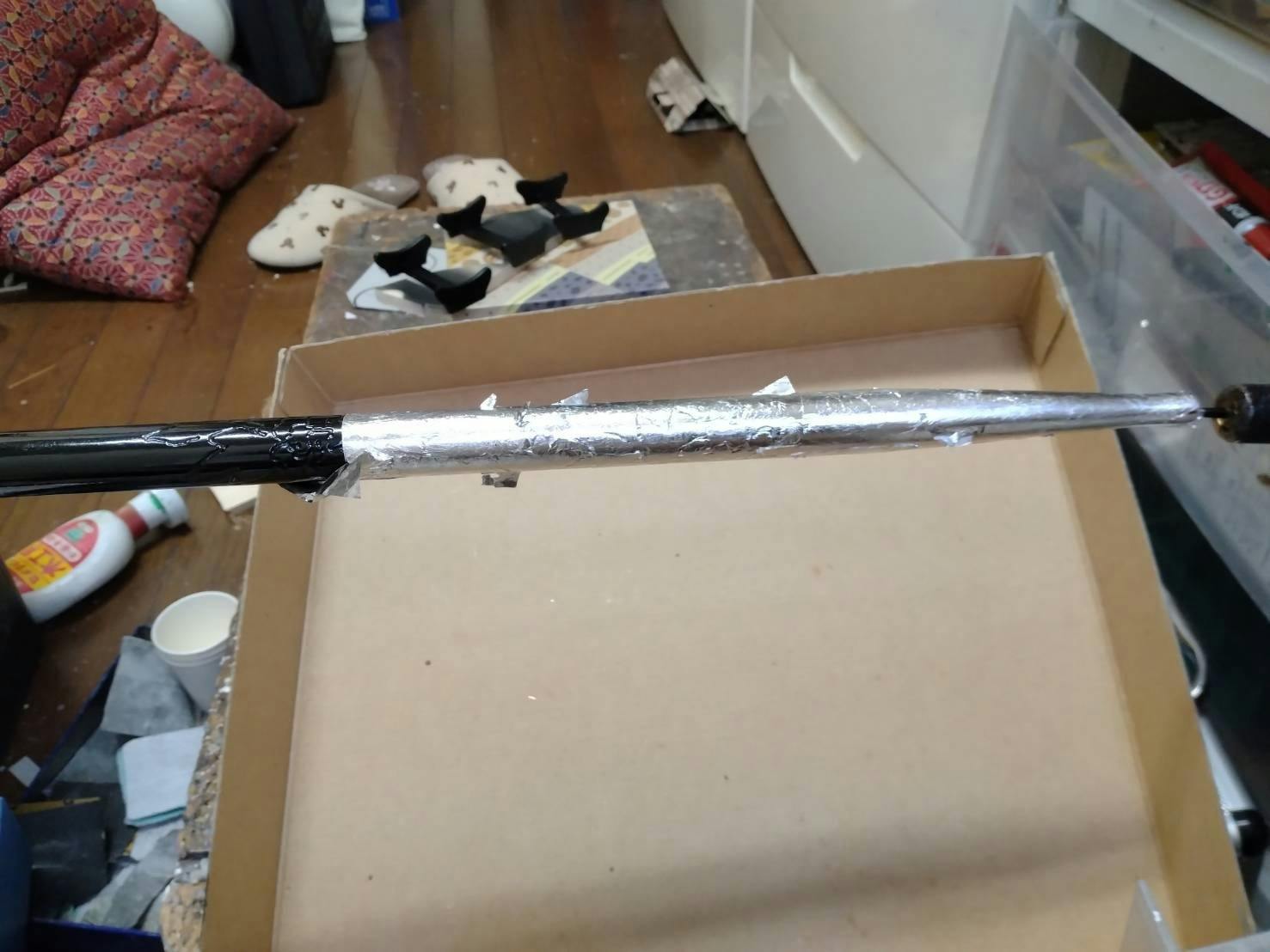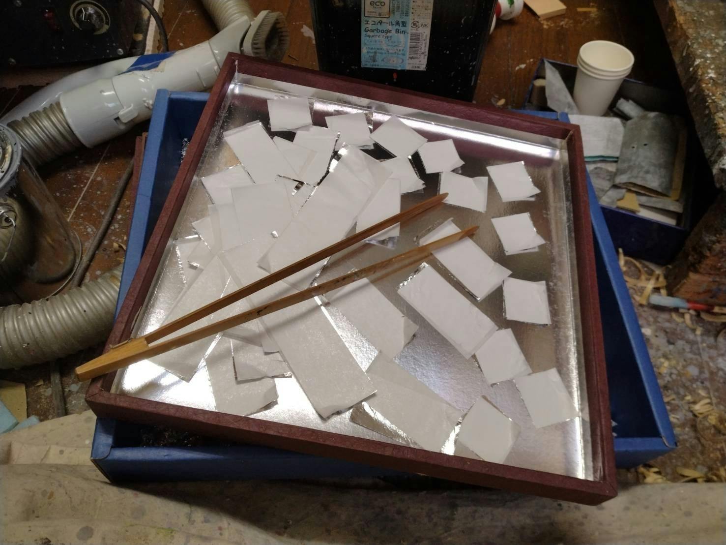 全体を黒く塗りその上に銀箔を貼り付けていきます。