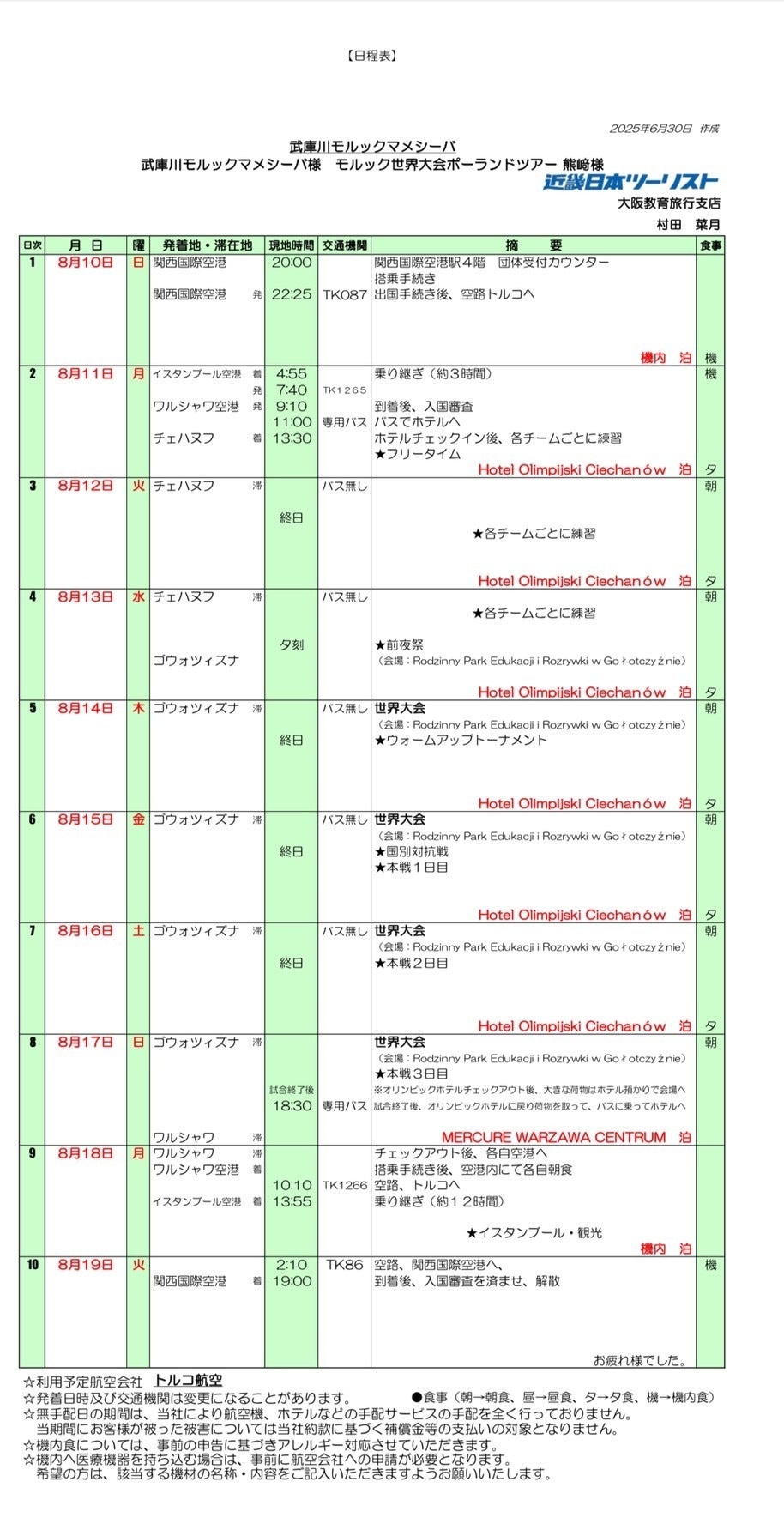 今回の世界大会出場にあたり、↓日程表になります(関西空港までは自家用車で向かいます)