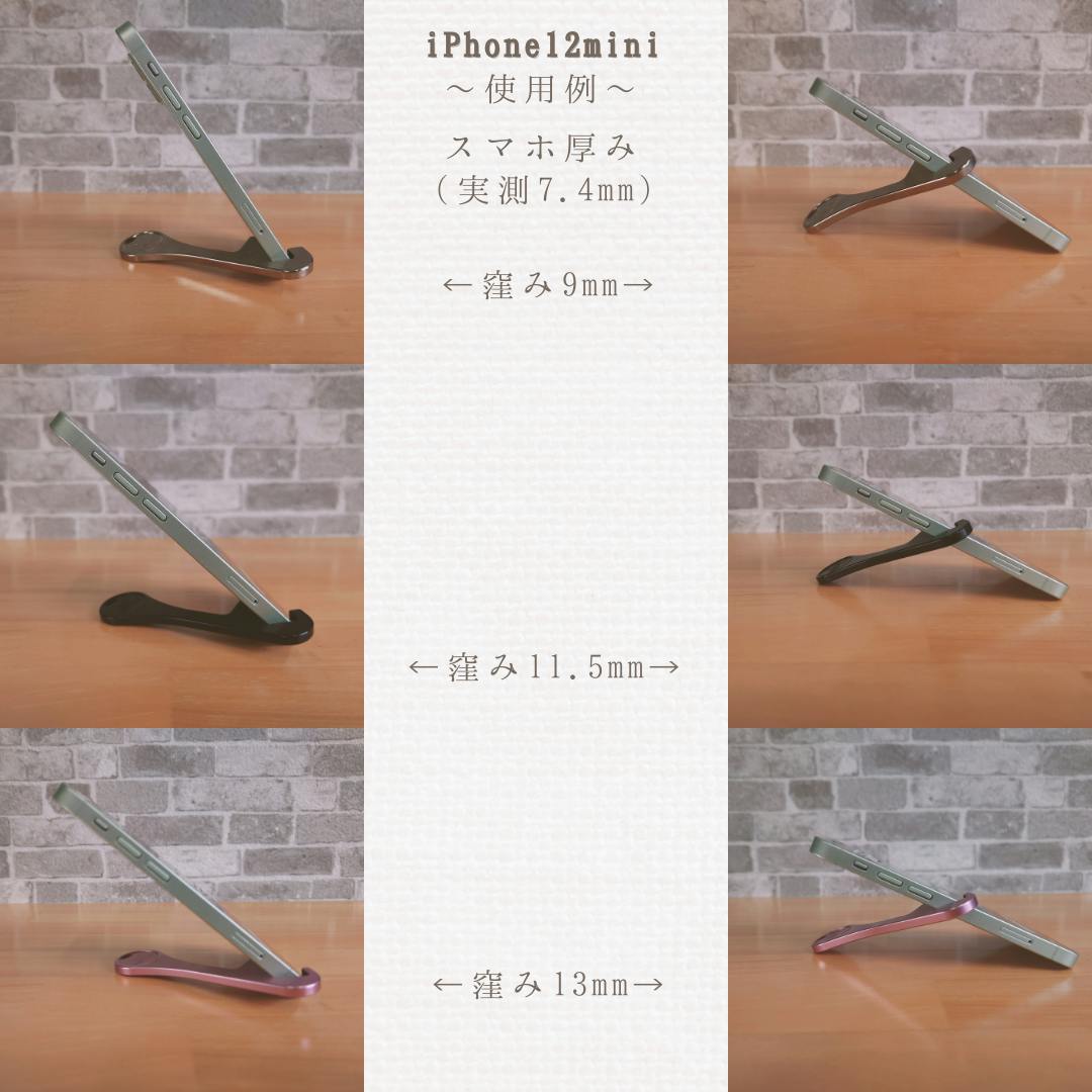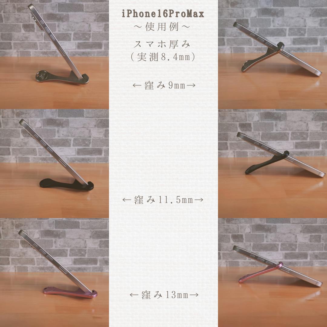 窪みの種類、9mm、11.5mm、13mmの3種類をそろえています。それぞれのスマートフォンの厚みに合わせて選定して頂く事により、好みの自立角度が可能になります。