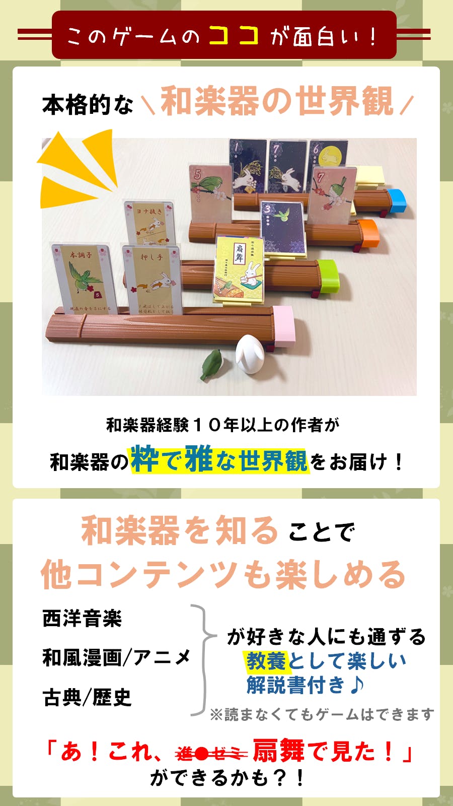 このゲームは、数字札を「音」として見立て、和楽器の完奏を目指す手札出し切りゲームです。