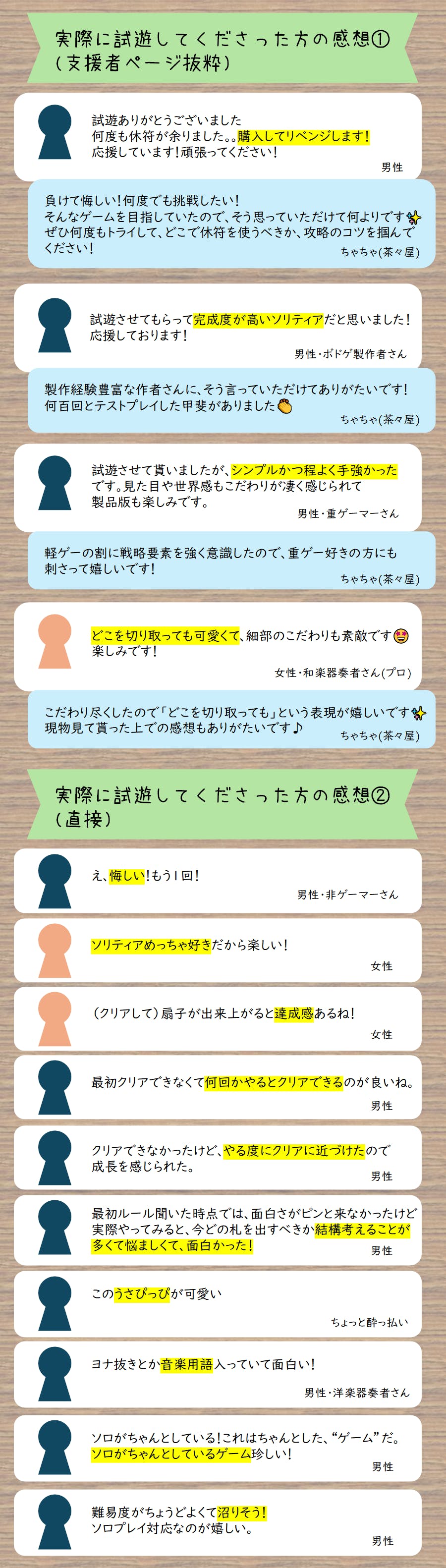 続々と寄せていただいている支援者さんのコメントや、今までテストプレイしてくださった方の感想をまとめました。