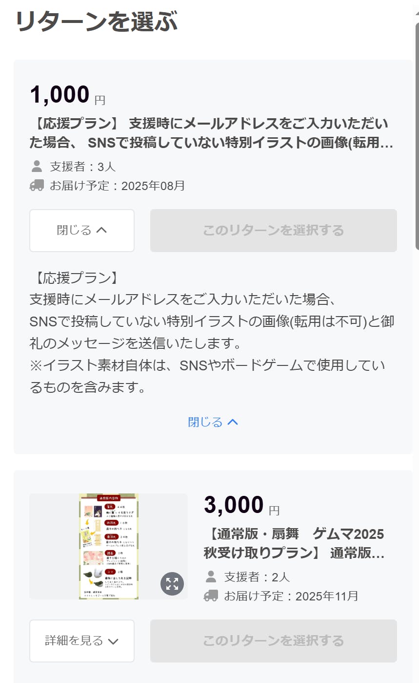 こちらは1,000円の、ゲームが付いてこないプランにご支援くださった方へのリターンとなります。