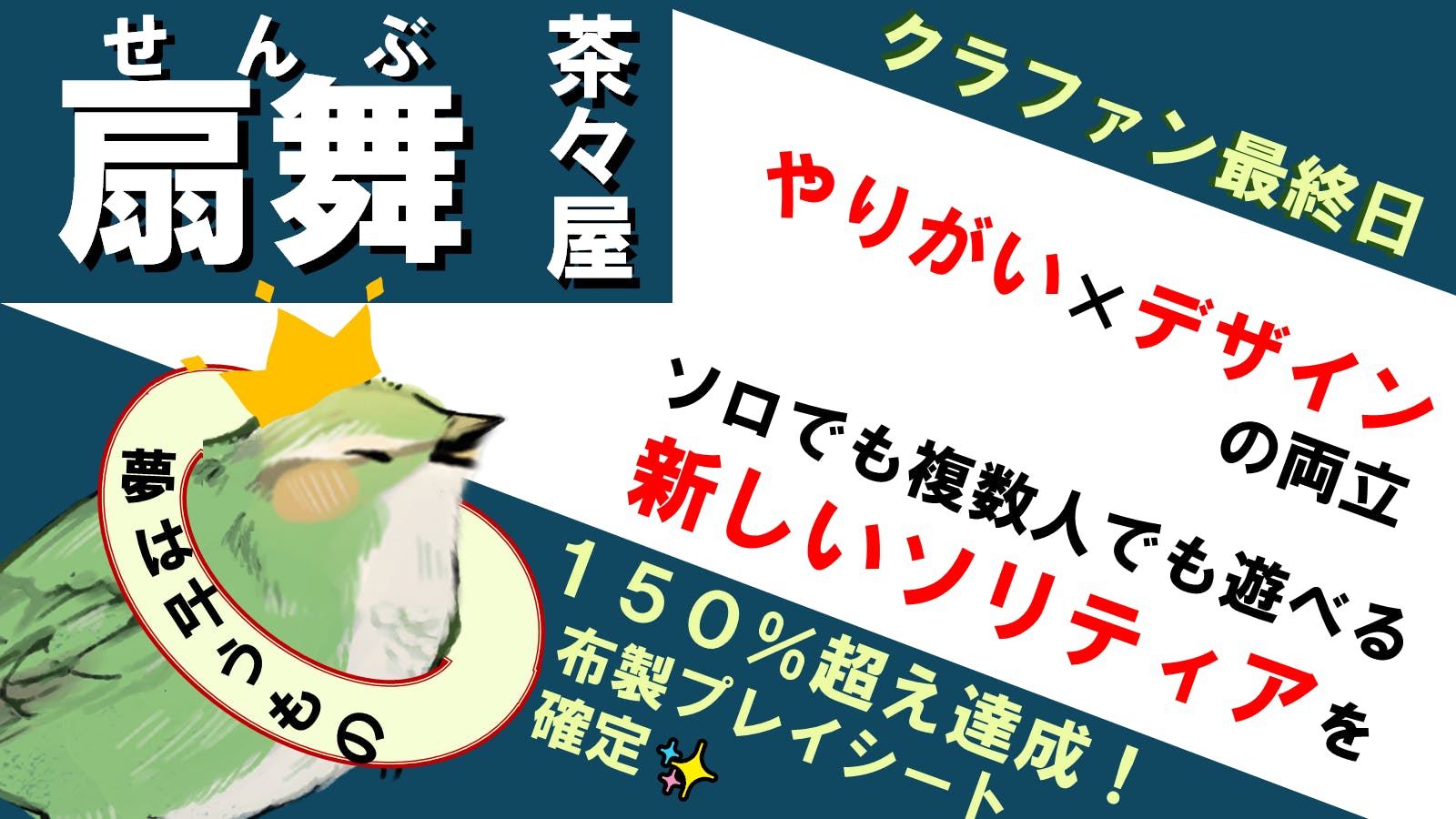 2025/07/22 02:047/20にクラウドファンディング、無事150%超えで達成しました!ここまで応援いただき、本当にありがとうございました。(画像は最終日130%くらいの時に、大慌てで作った選挙風ポスターの達成時の画像です。)Xの別アカウント(個人アカウント @chachaBoardgame)でも公開している内容にはなりますが、こちらが茶々屋:ちゃちゃの素直な感想です。―――――――――――――――――――――――――――――――――――――――――初出展なのに突然のクラファン。 夢追い人の見切り発車。怒涛の2週間でした… 途中、思うように結果が奮わない中で、目標達成に向けて、キャッチーな画像、動画、口コミ、特典、テストプレイを、イベントを求め常に試行錯誤を続けてきたかと思います。マーケスキルが低すぎて、出すもの出すもの後追い情報だらけでしたが、試行錯誤を繰り返して、最終的には何とか形になる宣伝が出来たのではないかと思います。半ば後悔しかけた時もありますが、ゲムマ前のマーケ練習にもなり、達成してもしなくても、自分のスキルを見つめ直す良い勉強になりました!応援してくださった皆様には感謝しかないです。ここで終わりでは無いので、引き続き頑張ります。―――――――――――――――――――――――――――――――――――――――――常に日々情報が更新されていったこのクラウドファンディングが、ある意味「がむしゃら」で、皆様の心に響いてくださったのか、やっぱり情報公開が遅くて裏目に出たか、結局のところ分かりませんが、素人の動きだったのは確かです。この経験を糧に、次のゲームマーケットに向けて、また精進していきたいと思います。皆様のお手元に届いたときに、このゲームが「宝物」となりますよう、引き続き調整を行っていきます。ゲームマーケットまであと4カ月、発送プランの方は約5カ月となりますが、どうぞよろしくお願いいたします。追伸:Xの有志の方がが開催されていた、ブースカットコンテストに参加中です!背景の色味を、お茶色に変えてみました。よろしければイイネなどで、引き続き応援してくださると嬉しいです。 もっと見る