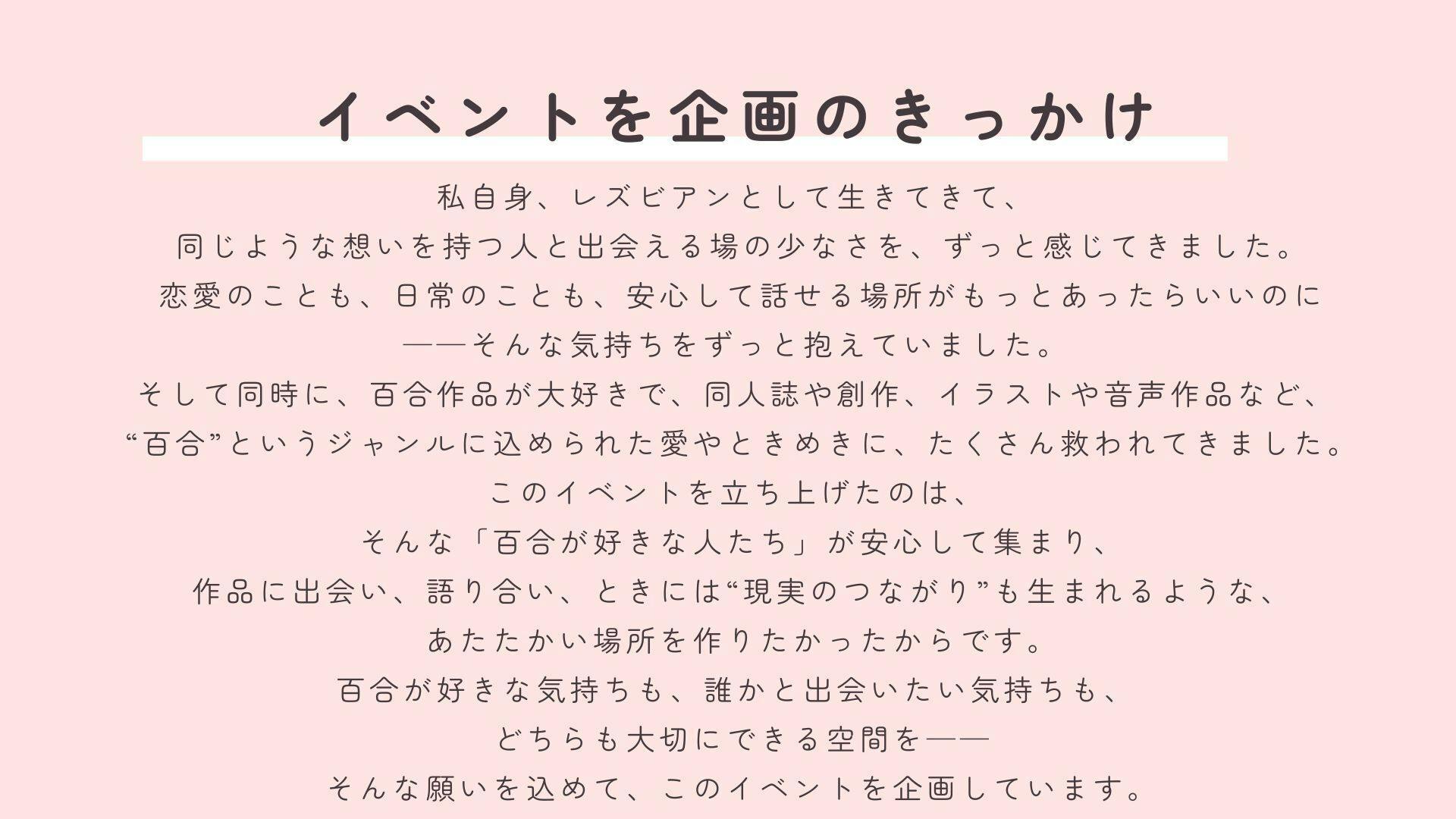 好きな作品を手に取り、語り合い、ときには“リアルな彼女と彼女”が生まれるような──そんな場所をつくりたくて、このイベントを企画しました。